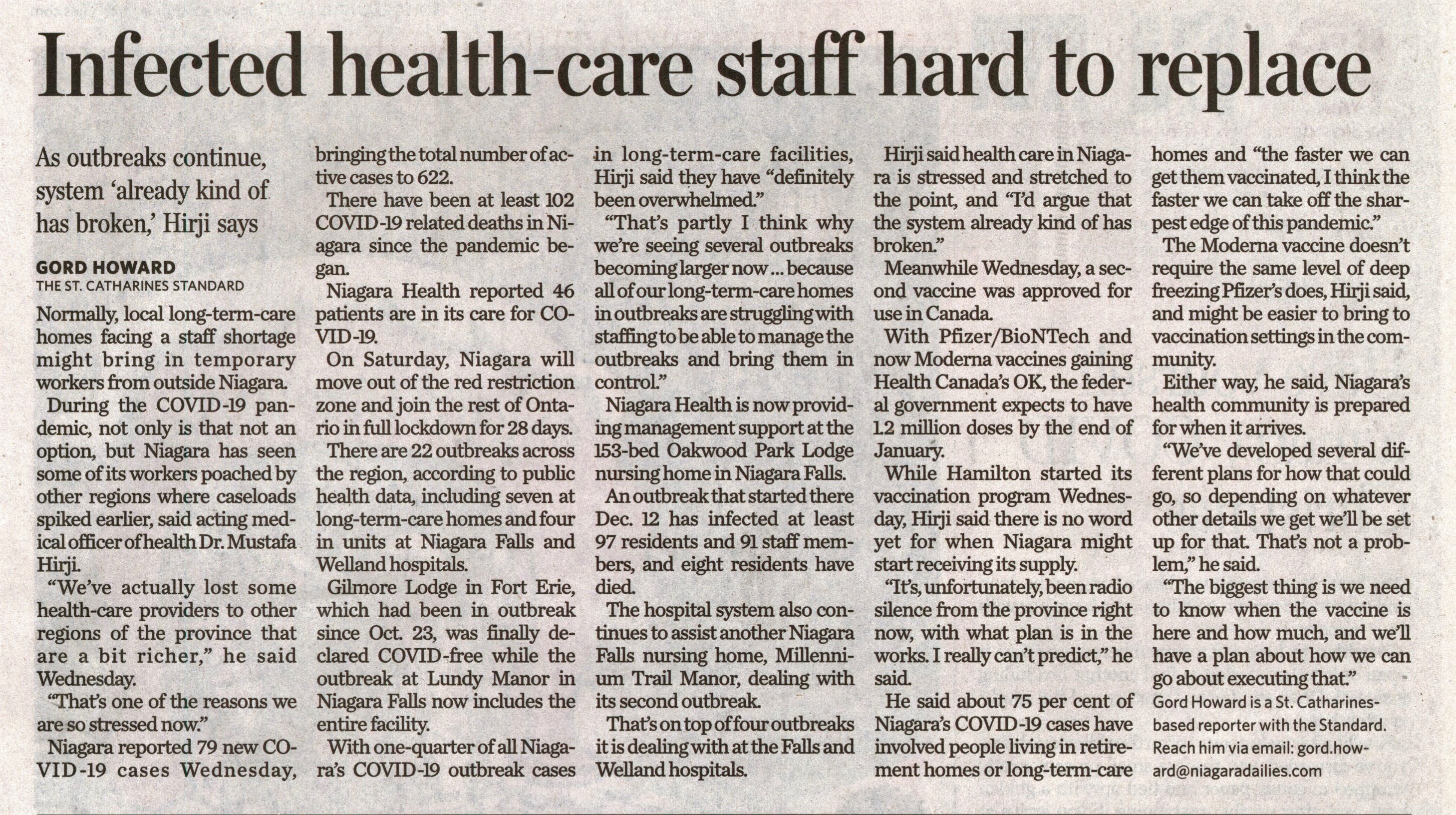 Infected health-care staff hard to replace : As outbreaks continue, system 'already kind of has broken,' Hirji says