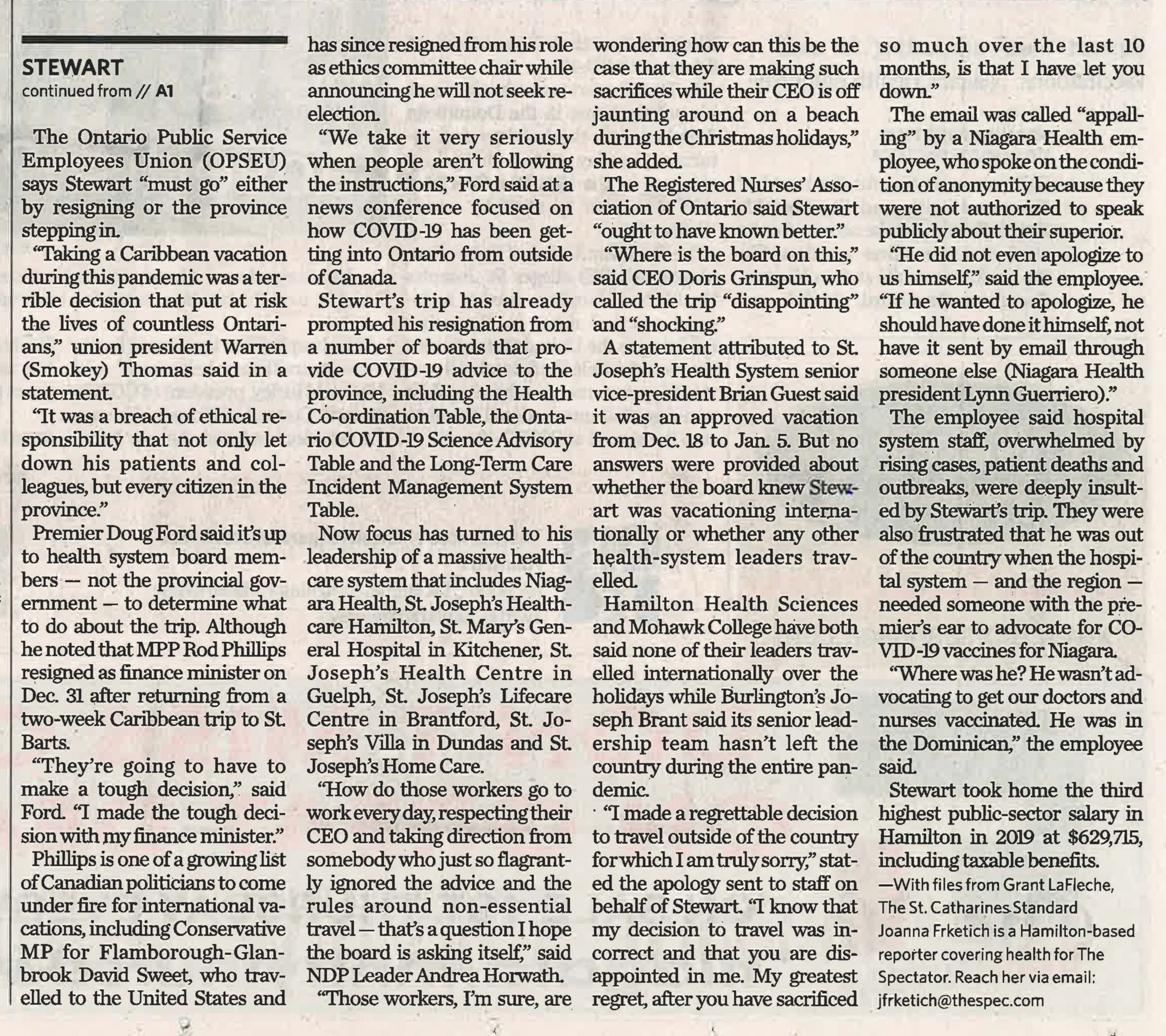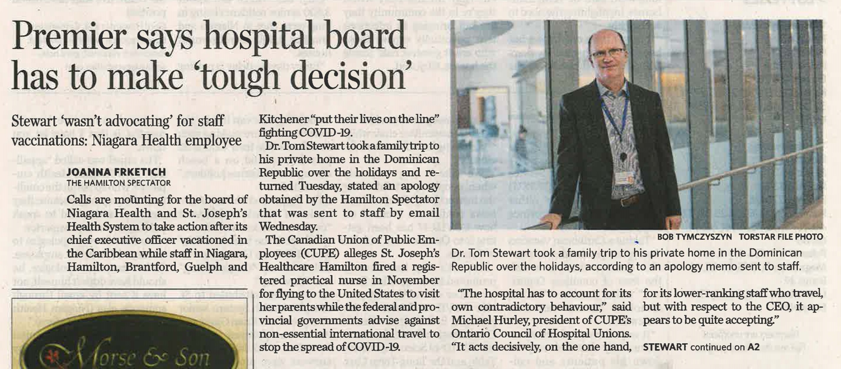 - Premier says hospital board has to make 'tough decision' : Stewart 'wasn't advocating' for staff vaccinations: Niagara Health employee