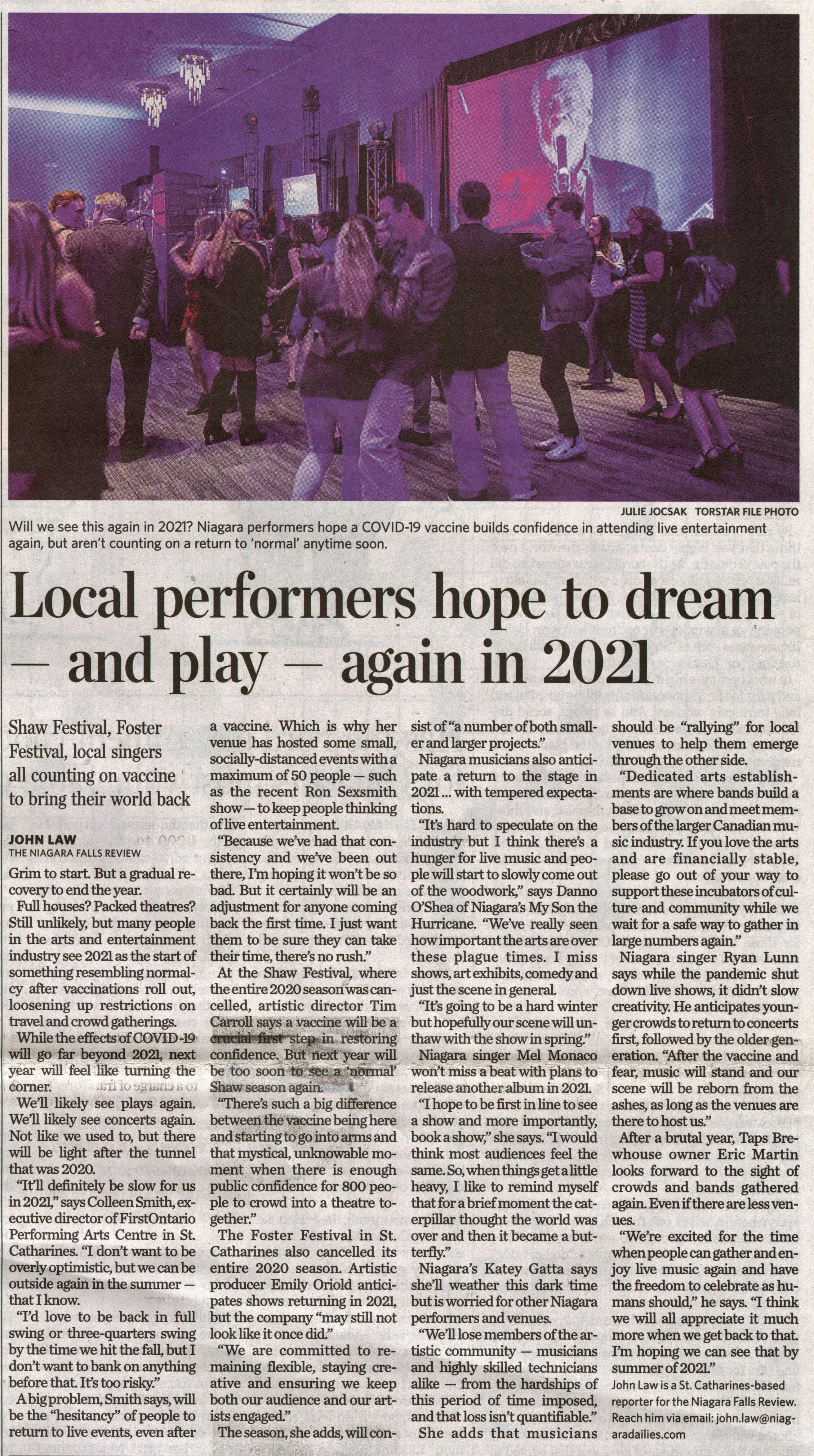 - Local performers hope to dream -- and play -- again in 2021 : Shaw Festival, Foster Festival, local singers all counting on vaccine to bring their world back