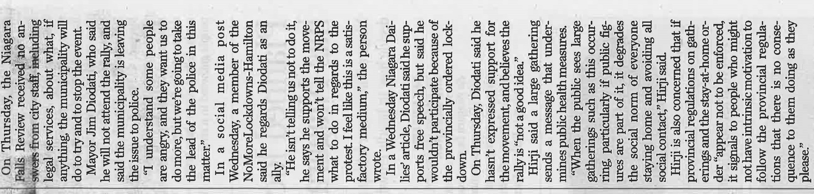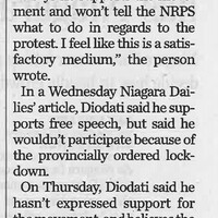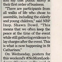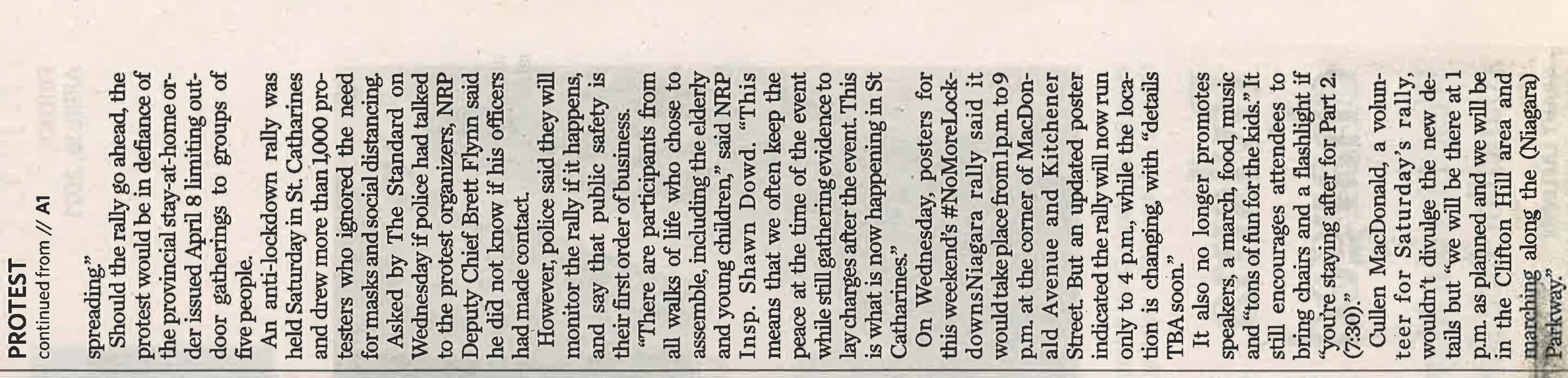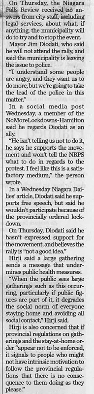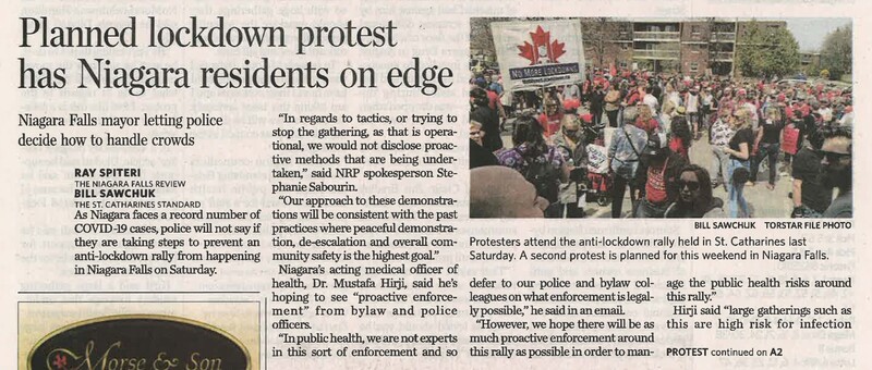 - COVID-19 pandemic / anti-lockdown rally / Sabourin, Stephanie / Niagara Regional Police / Hirji, Mustafa Dr. / bylaw officers /