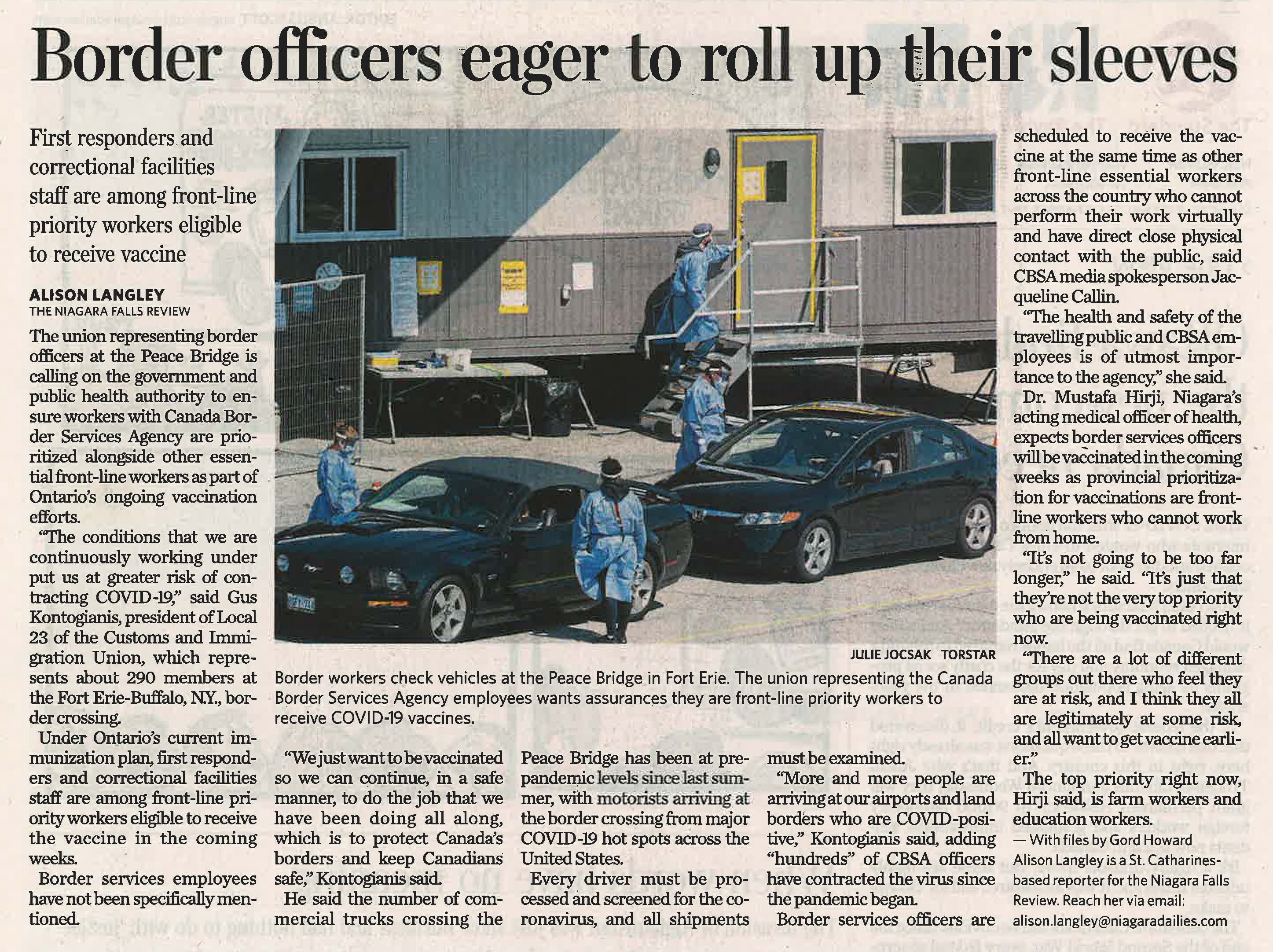 - Border officers eager to roll up their sleeves : First responders and correctional facilities staff are among front-line priority workers eligible to receive vaccine