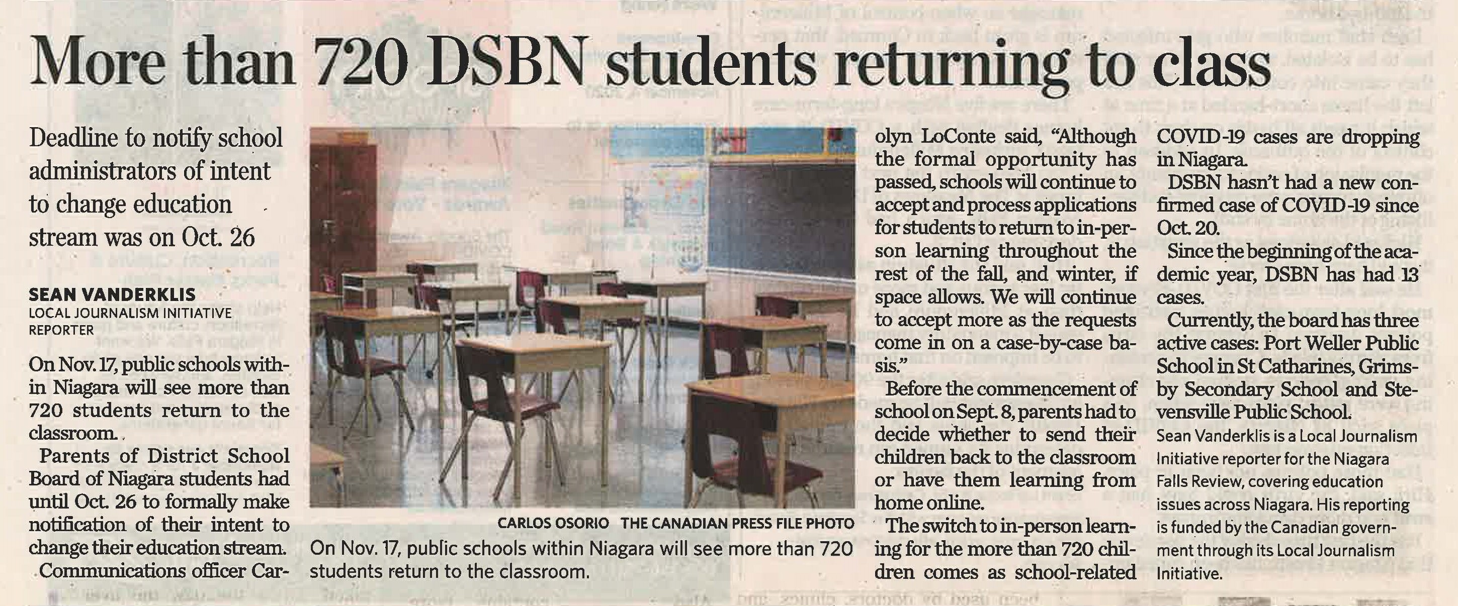 - More than 720 DSBN students returning to class : deadline to notify school administrators of intent to change education stream was on Oct. 26