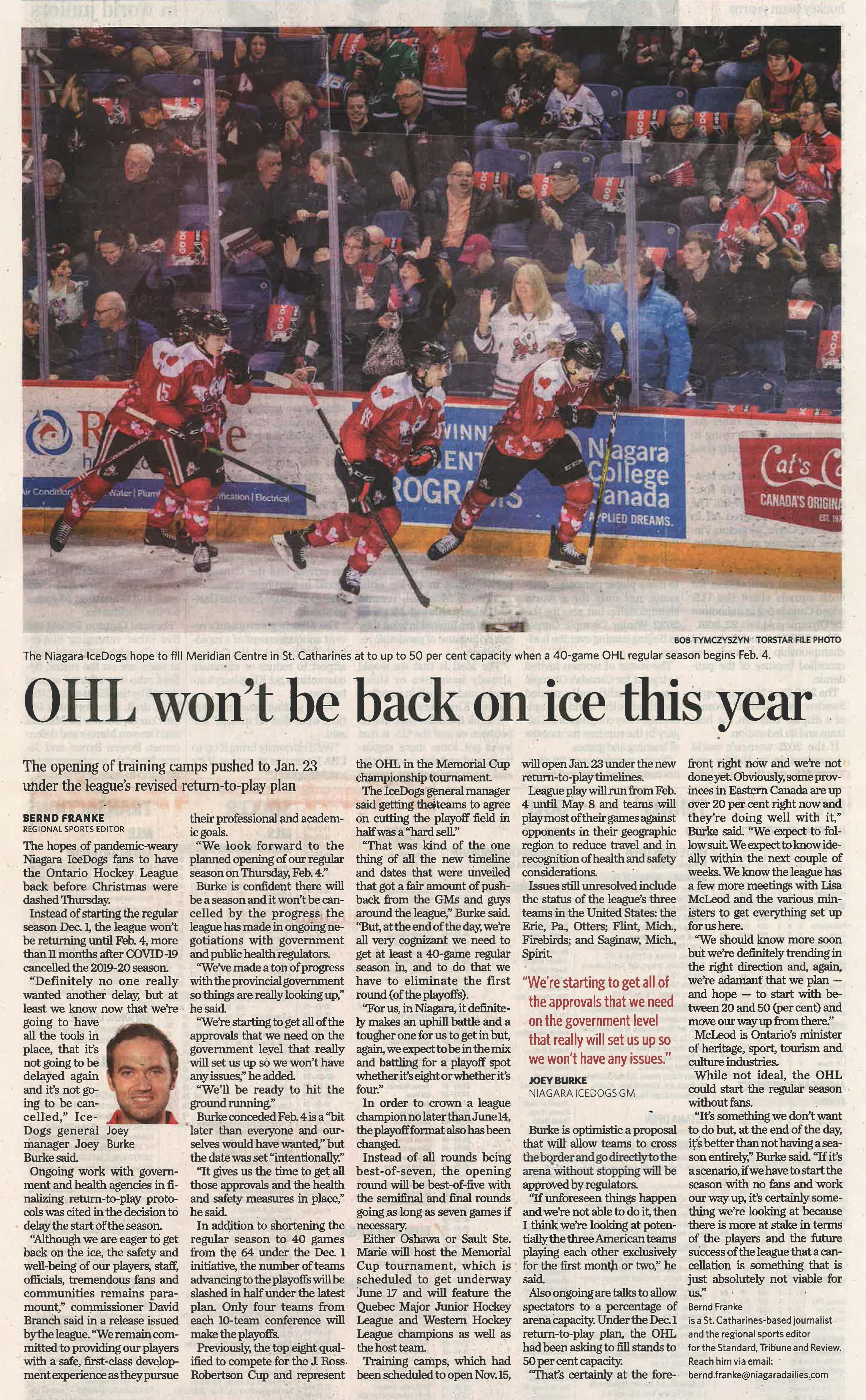- OHL won't be back on ice this year : the opening of training camps pushed to Jan. 23 under the league's revised return-to-play plan