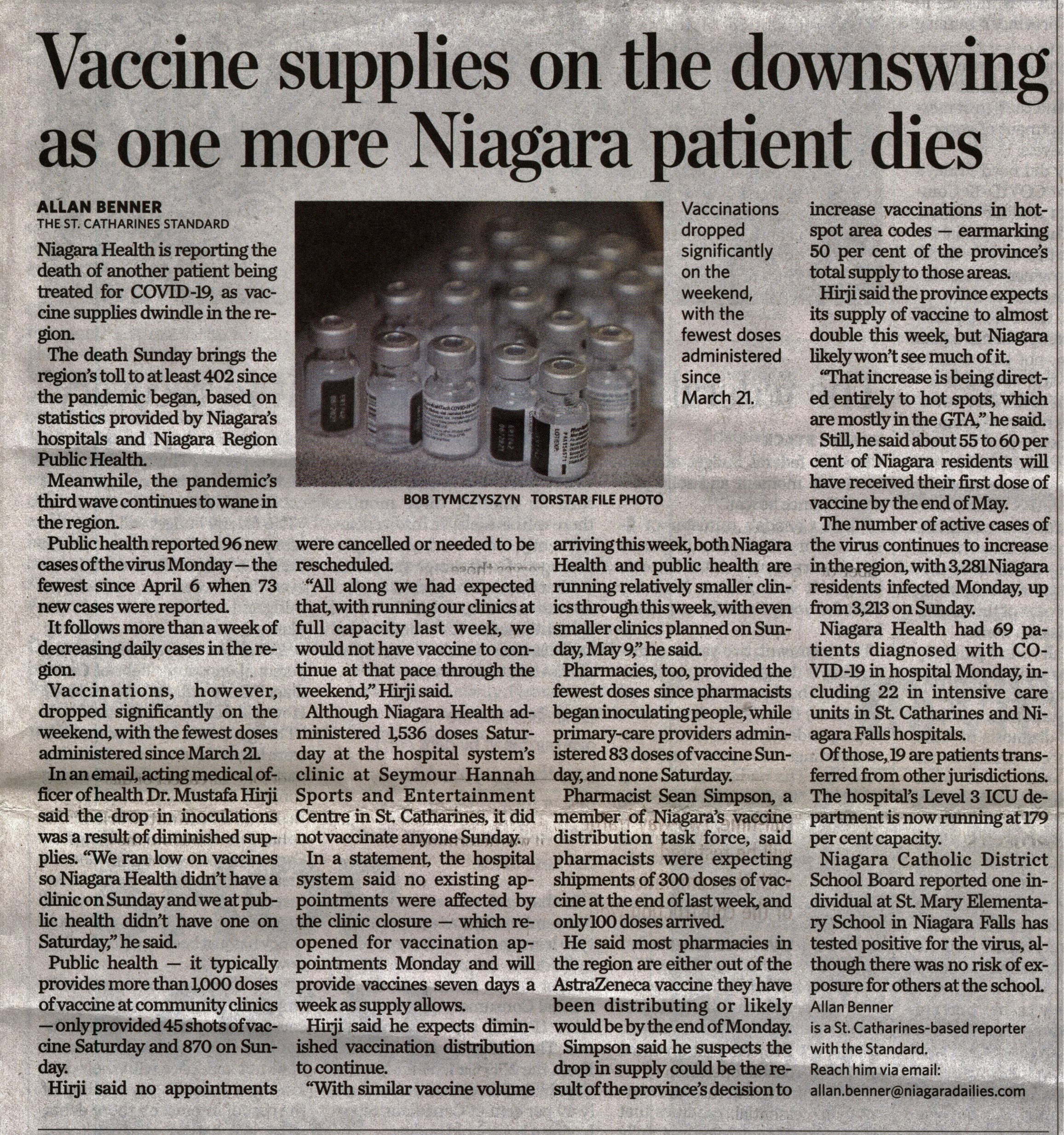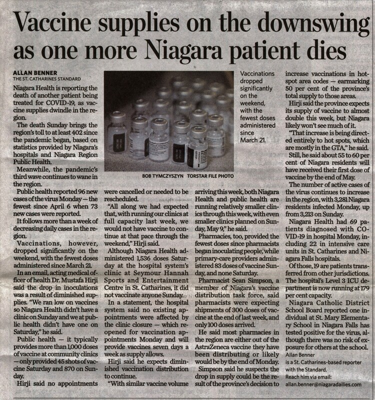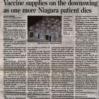 - Vaccine supplies on the downswing as one more Niagara patient dies