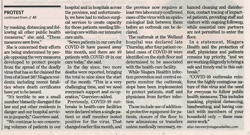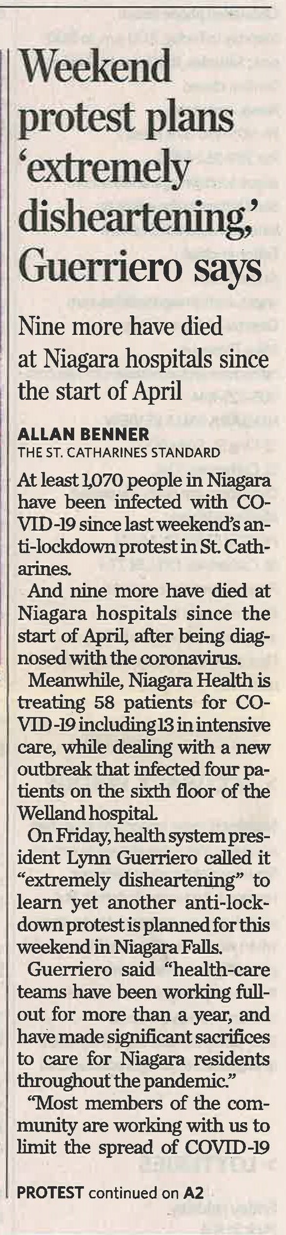 - COVID-19 pandemic / anti-lockdown protest / Niagara Health / Guerriero, Lynn