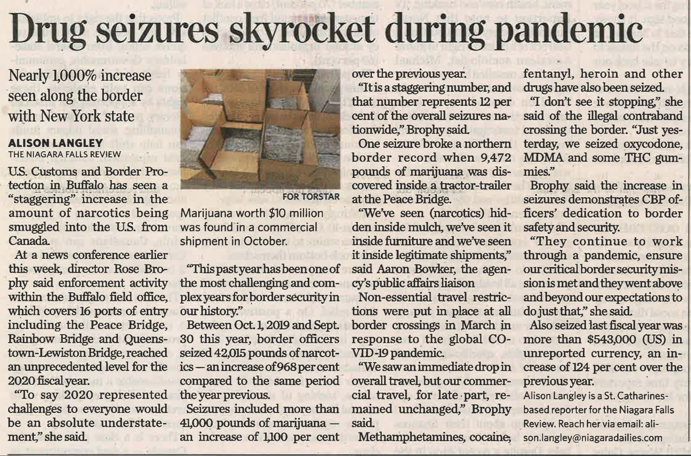 - Drug seizures skyrocket during pandemic : nearly 1,000% increase seen along the border with New York state