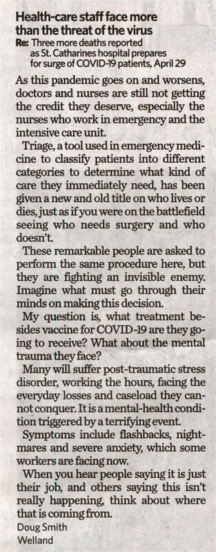 Health-care staff face more than the threat of the virus : Re : Three more deaths reported as St. Catharines hospital prepares for surge of COVID-19 patients, April 29