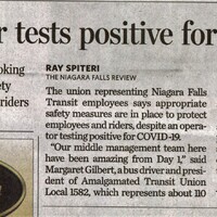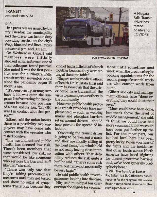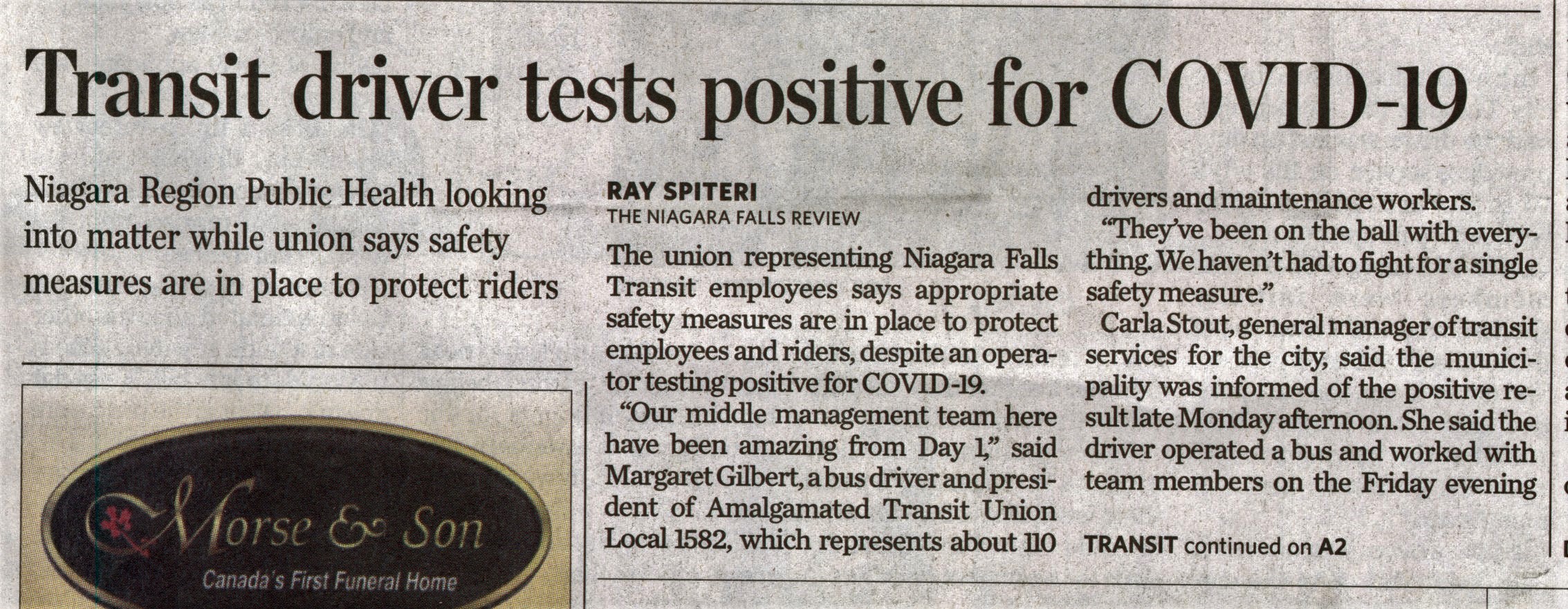 - Transit driver tests positive for COVID-19 : Niagara Region Public Health looking into matter while union says safety measures are in place to protect riders