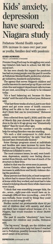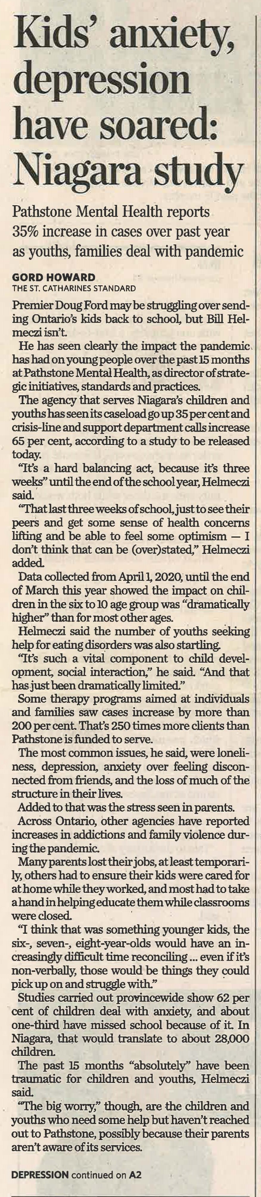 - Kids' anxiety, depression have soared : Niagara study : Pathstone Mental Health reports 35% increase in cases over past year as youths, families deal with pandemic