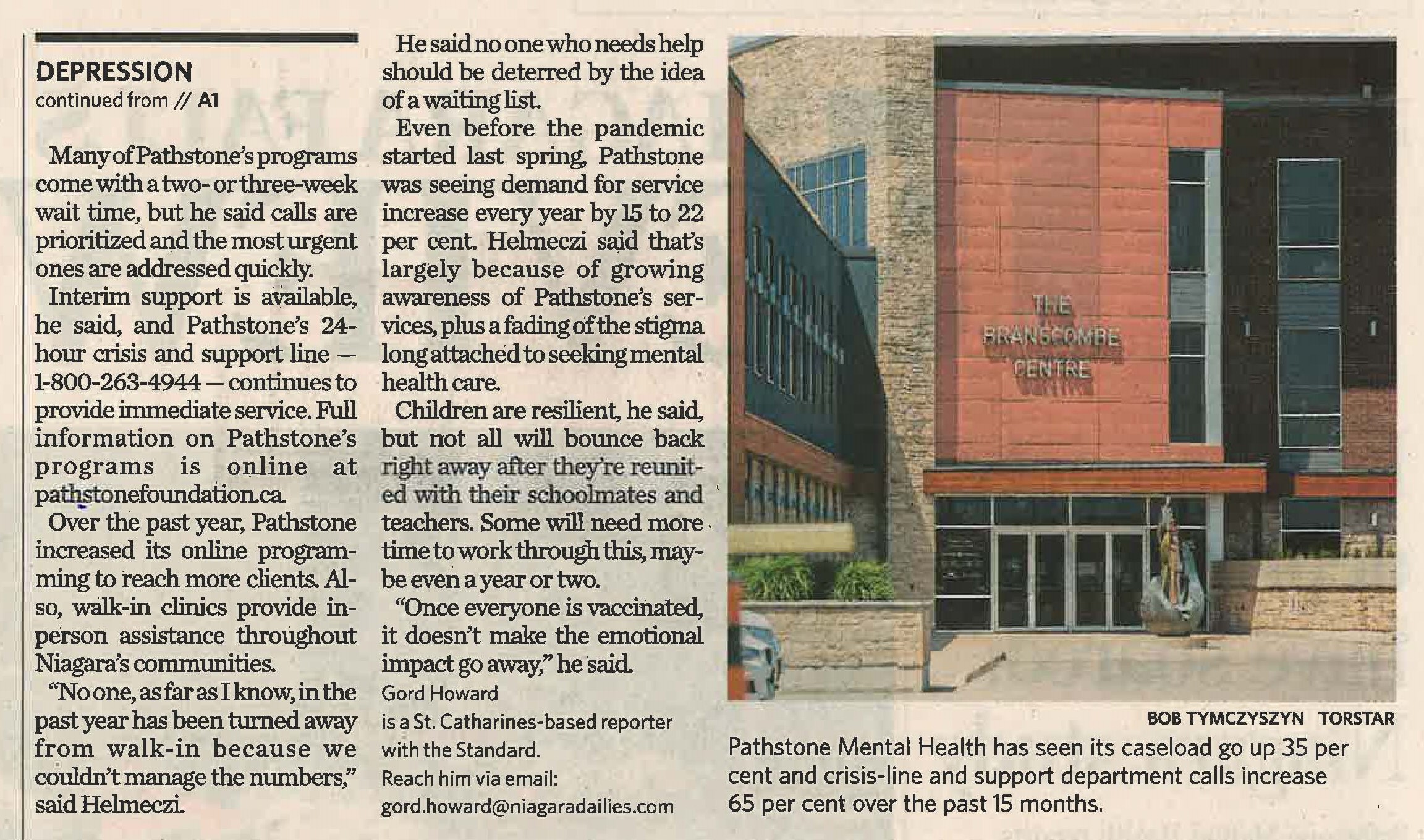 Kids' anxiety, depression have soared : Niagara study : Pathstone Mental Health reports 35% increase in cases over past year as youths, families deal with pandemic