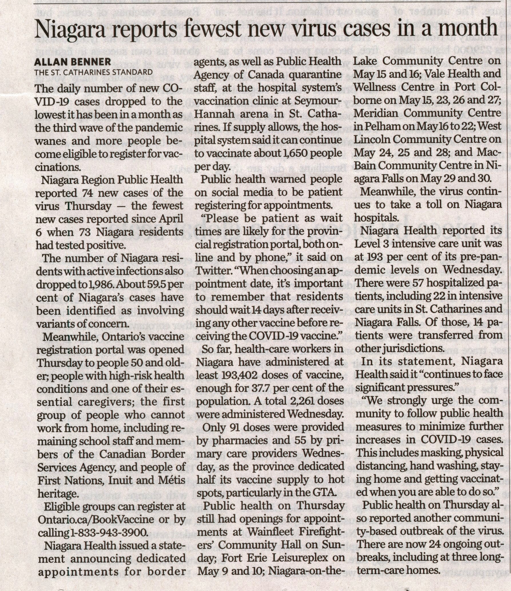 - Niagara Reports fewest new virus cases in a month