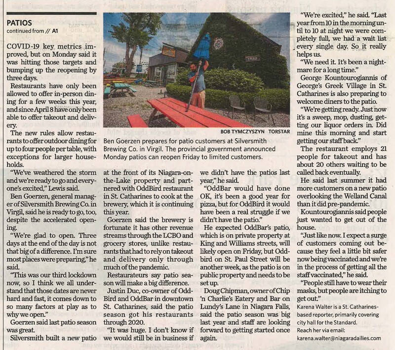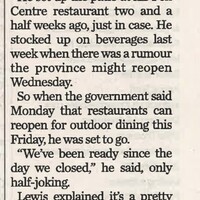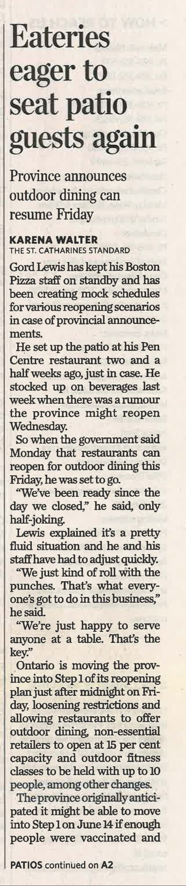 - Eateries eager to seat patio guests again : province announces outdoor dining can resume Friday