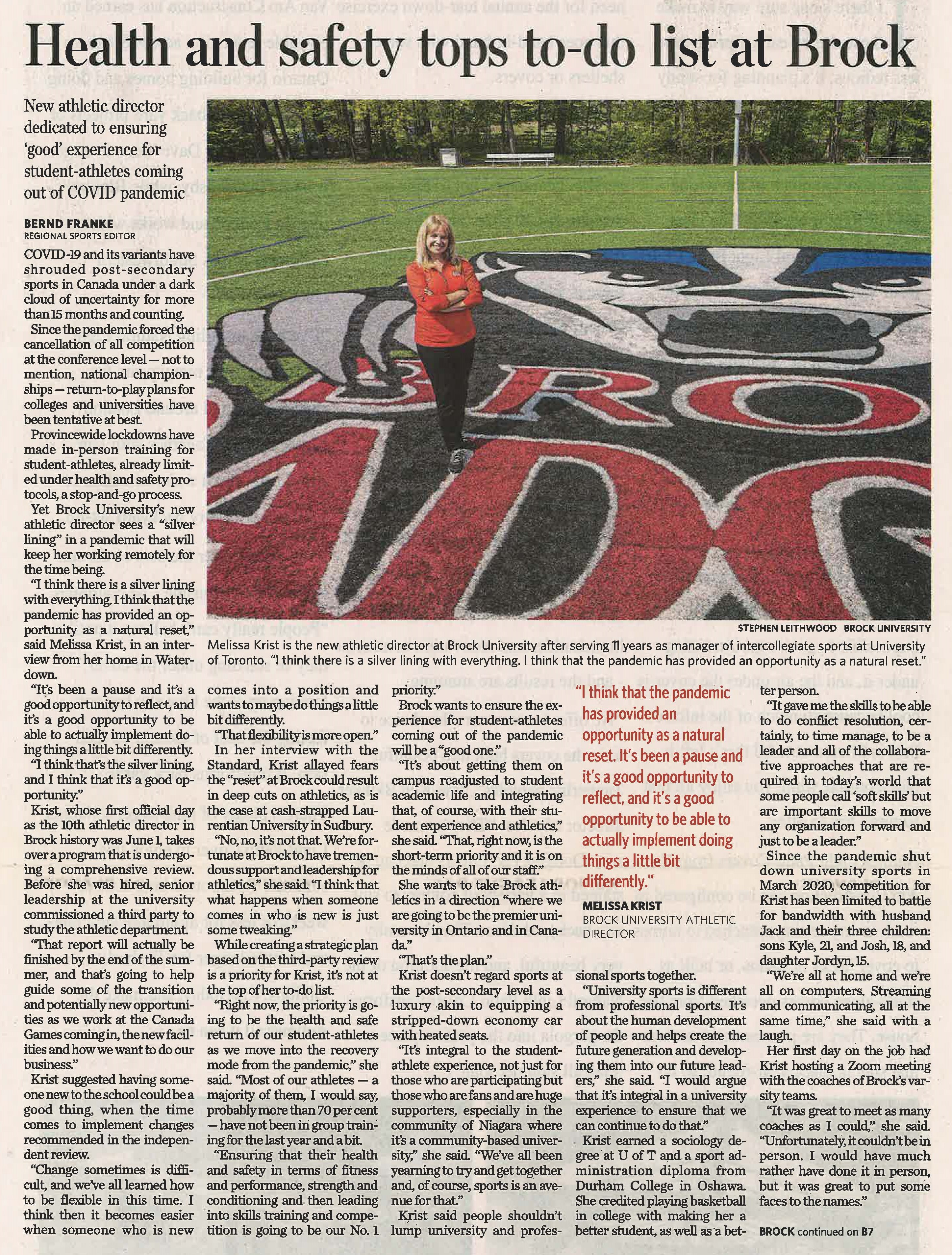 - Health and safety tops to-do list at Brock : new athletic director dedicated to ensuring good experience for student-athletes coming out of COVID pandemic