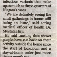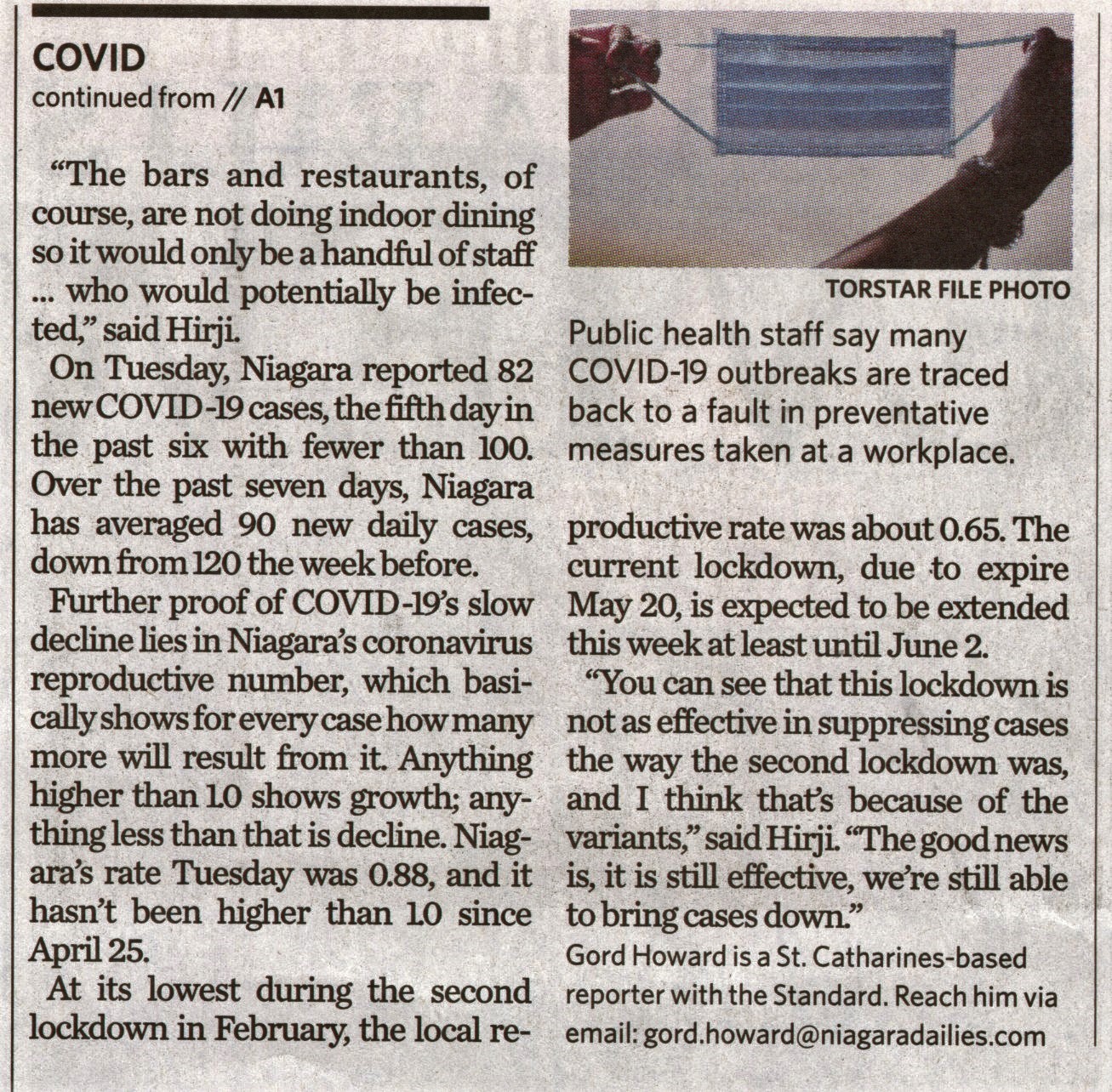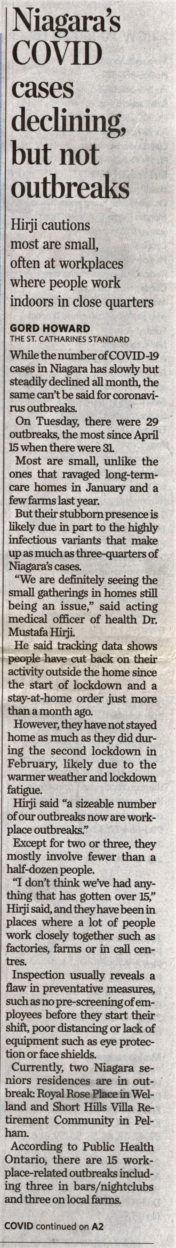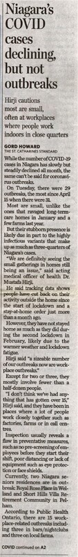 - Niagara's COVID cases declining, but not outbreaks : Hirji cautions most are small, often at workplaces where people work indoors in close quarters
