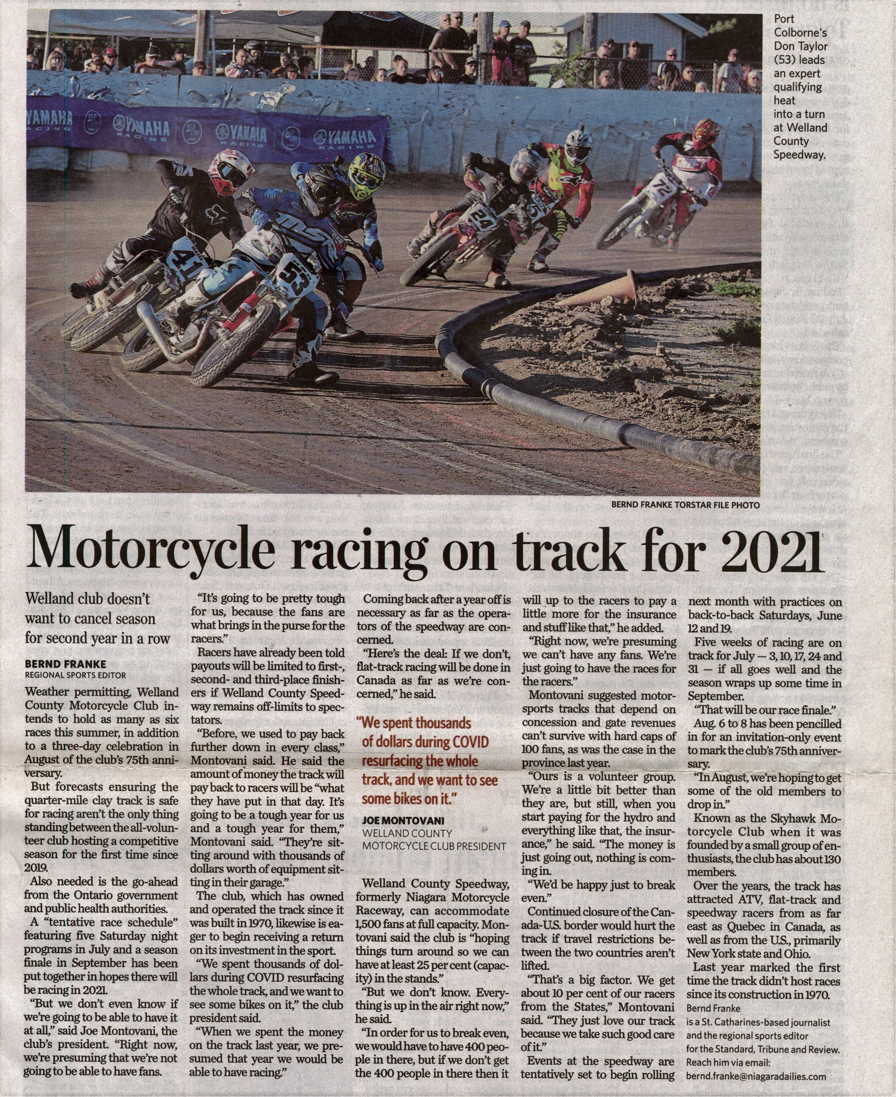 - Motorcycle racing on track for 2021 : Welland club doesn't want to cancel season for second year in a row