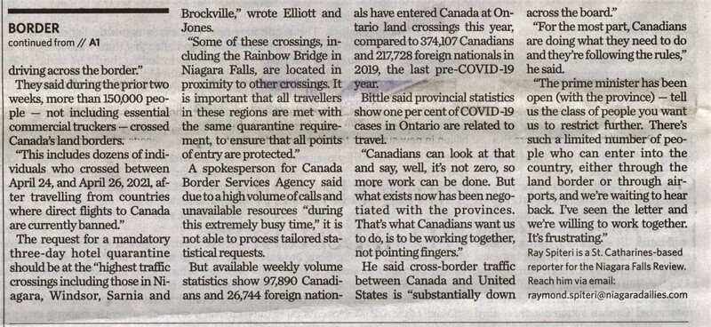 - Finger pointing from province about border 'frustrating' : MP : Ontario government sends formal request to federal government demanding that three-day quarantine at hotels be a requirement