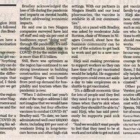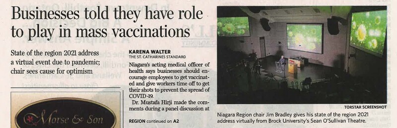 - Bradley, Jim / Brock University's Sean O'Sullivan Theatre / state of the region address / COVID-19 pandemic / Hirji, Mustafa Dr. / vaccine / Niagara Region