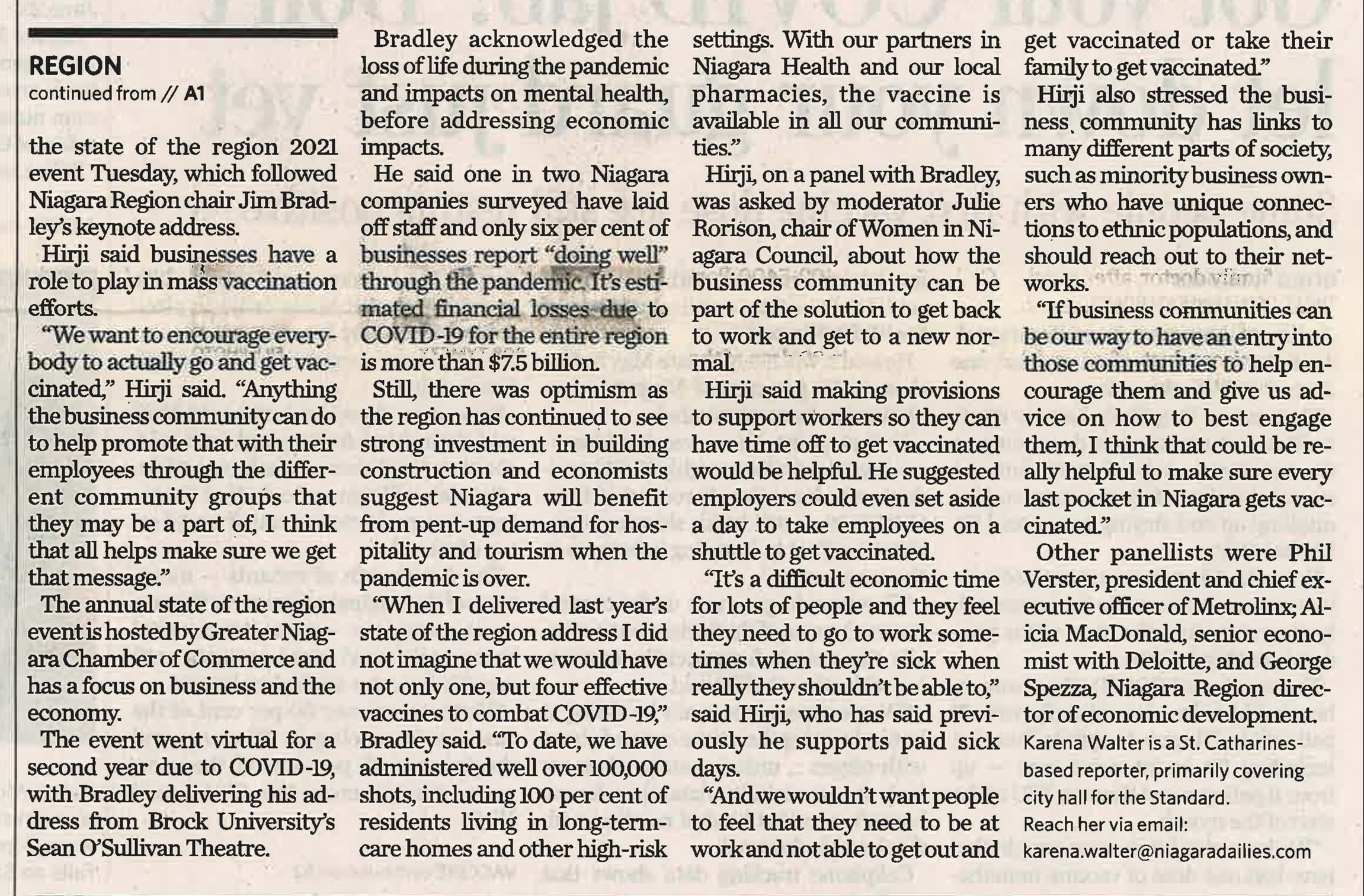 - Businesses told they have role to play in mass vaccinations : State of the region 2021 address a virtual event due to pandemic; chair sees cause for optimism