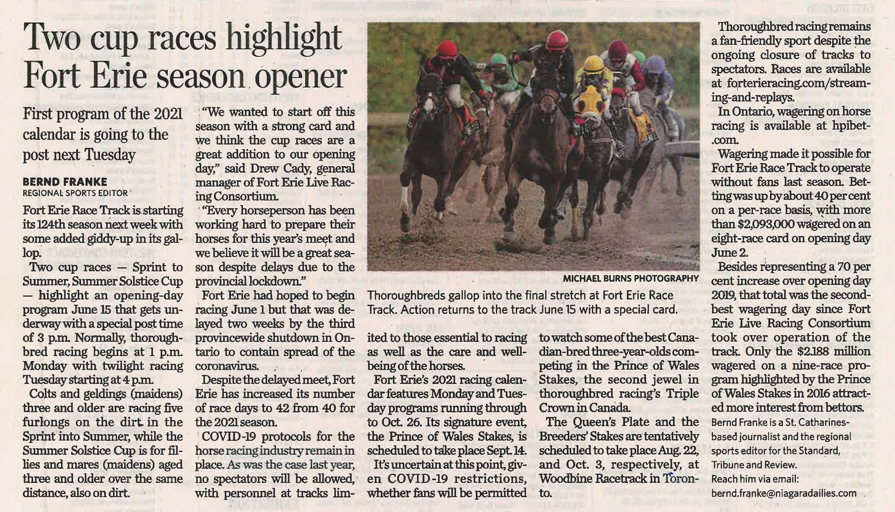 Two cup races highlight Fort Erie season opener : first program of the 2021 calendar is going to the post next Tuesday