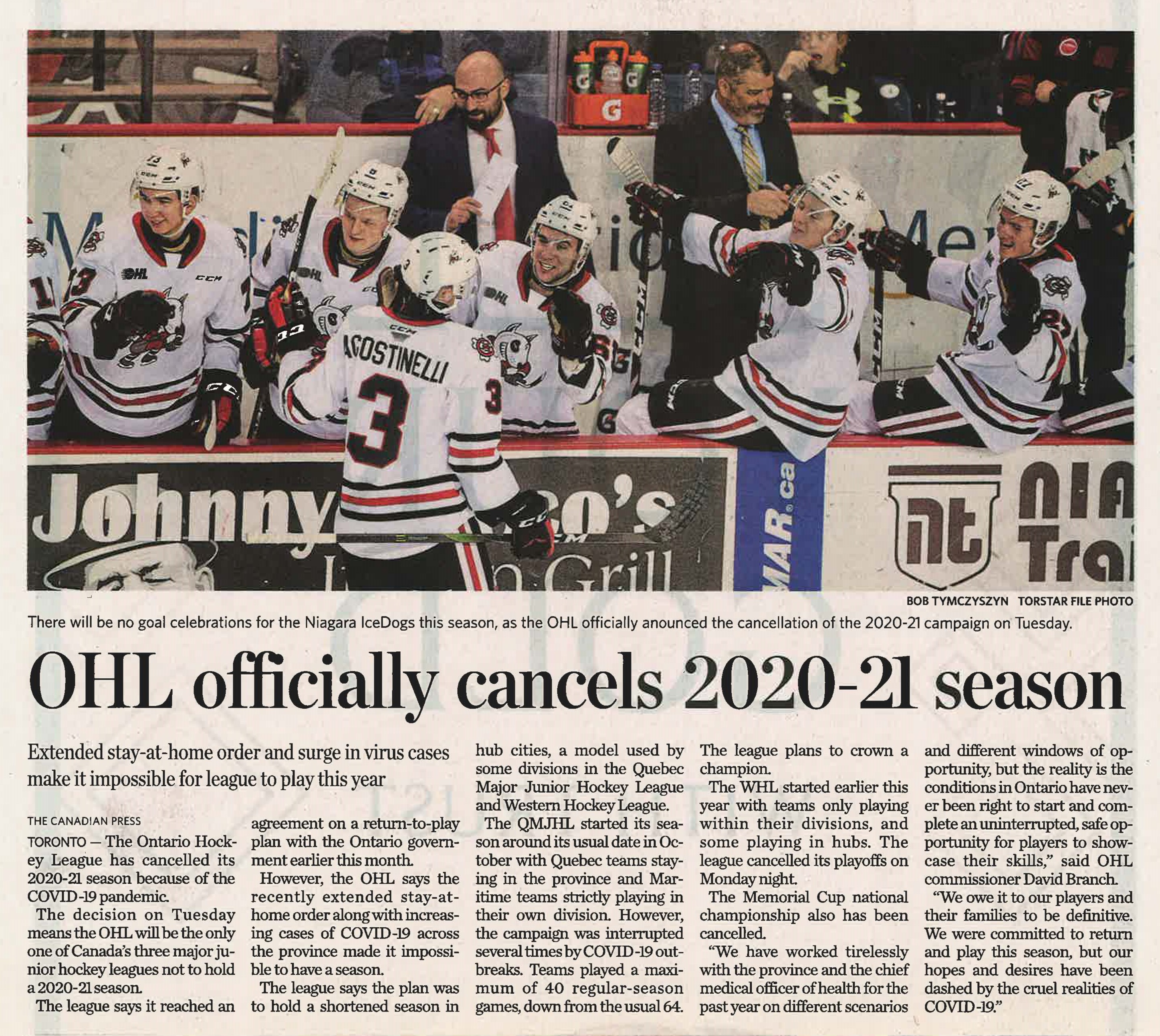 - OHL officially cancels 2020-21 season : Extended stay-at-home order and surge in virus cases make it impossible for league to play this year