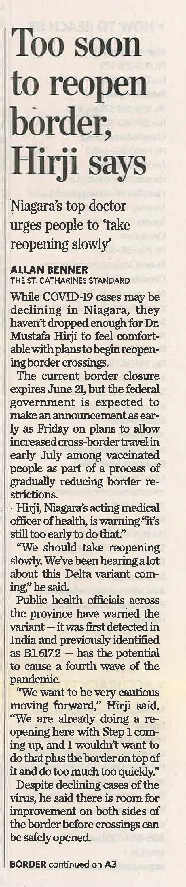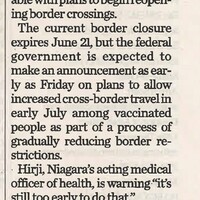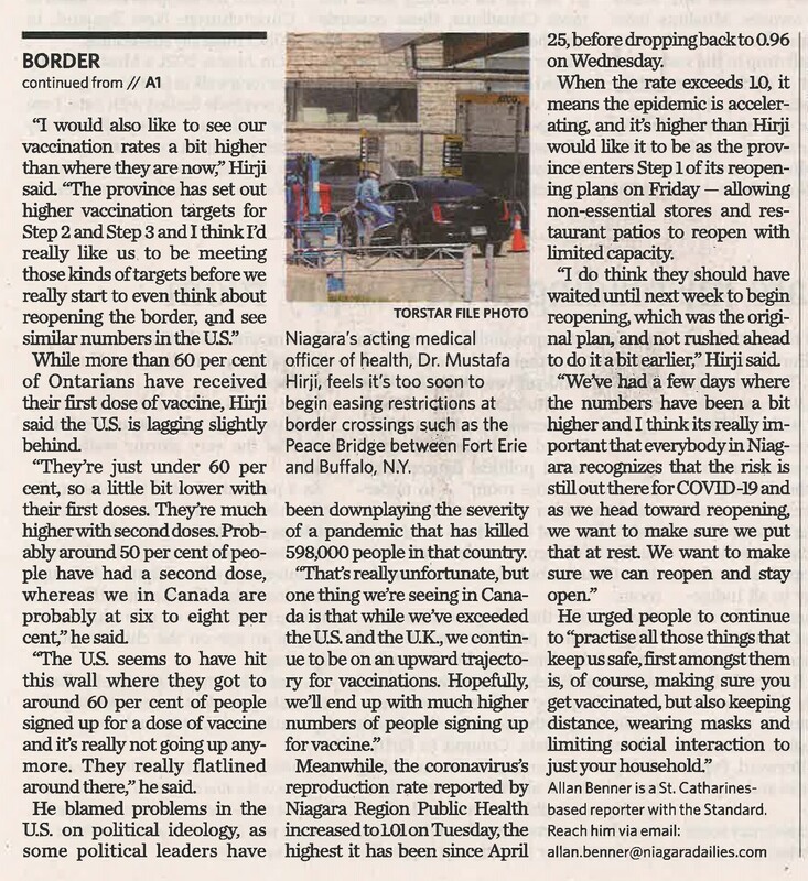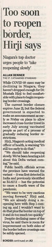 - Too soon to reopen border, Hirji says : Niagara's top doctor urges people to take reopening slowly