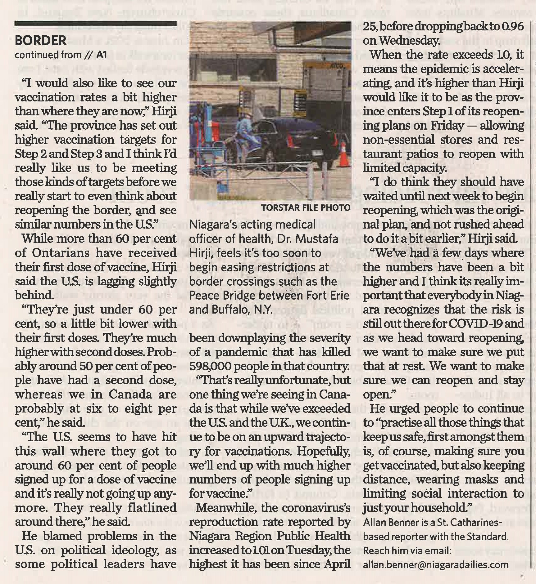 Too soon to reopen border, Hirji says : Niagara's top doctor urges people to take reopening slowly