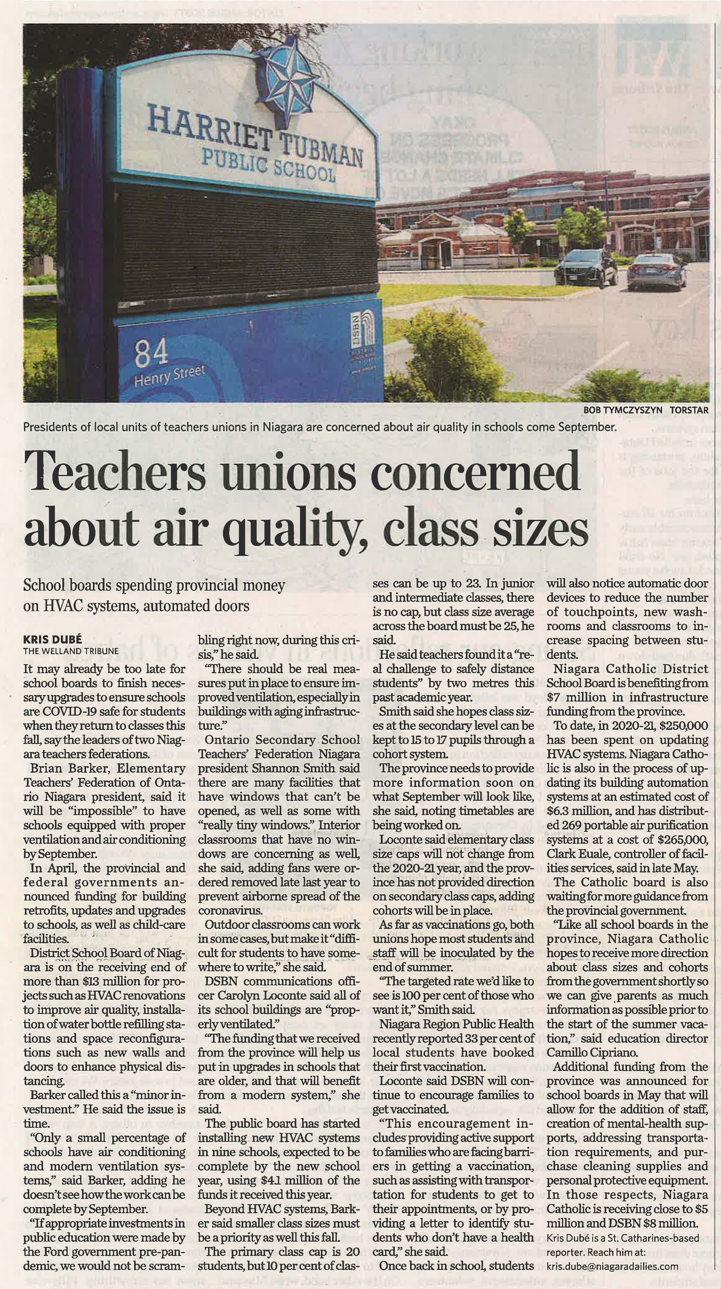 - Teachers unions concerned about air quality, class size : school boards spending provincial money on HVAC systems, automated doors