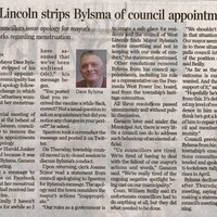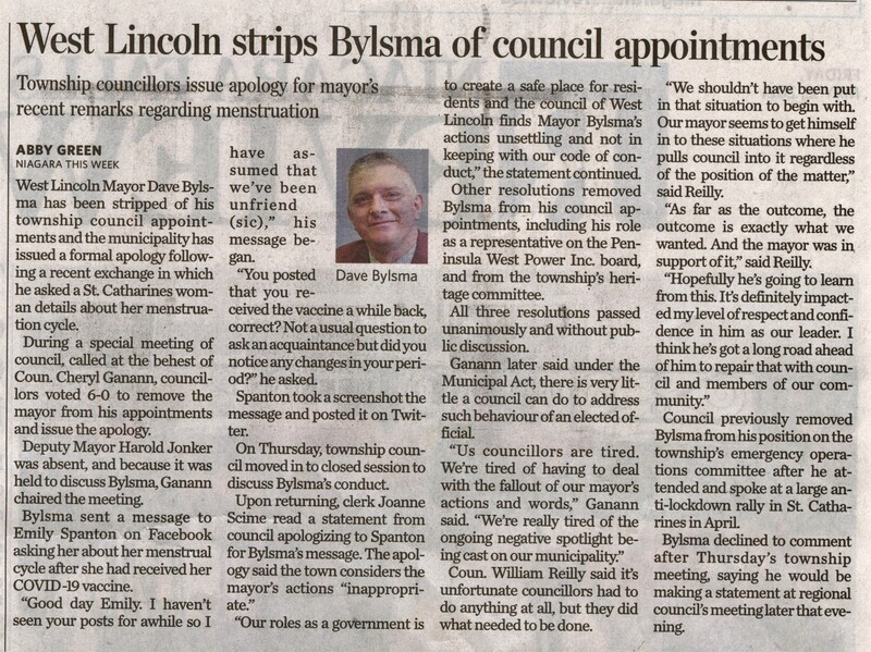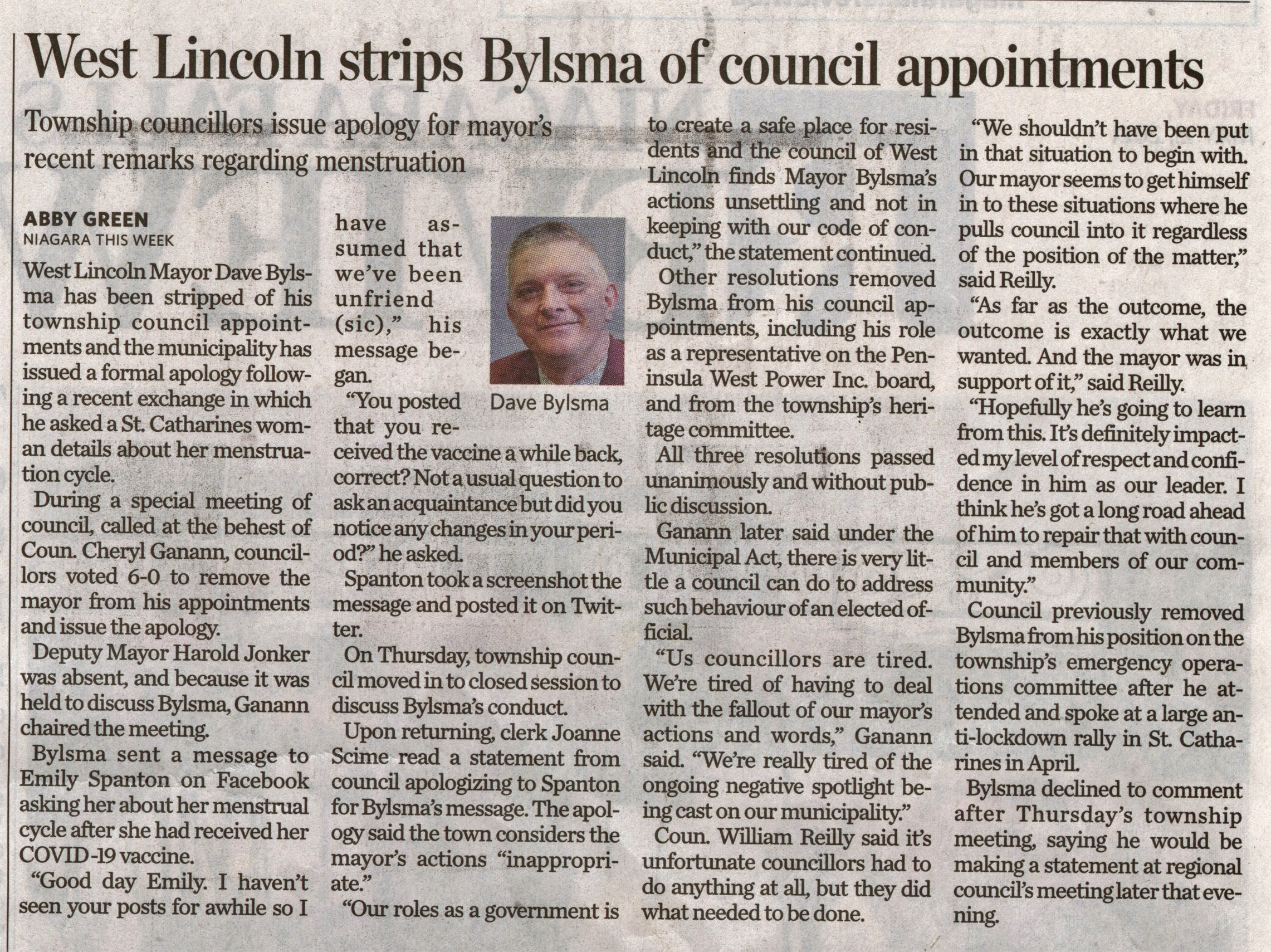 - West Lincoln strips Bylsma of council appointments : Township councillors issue apology for mayor's recent remarks regarding menstruation