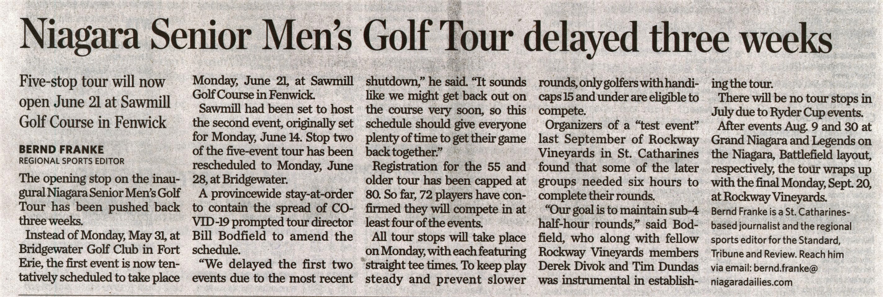 - Niagara Senior Men's Golf Tour delayed three weeks : Five-stop tour will now open June 21 at Sawmill Golf Course in Fenwick