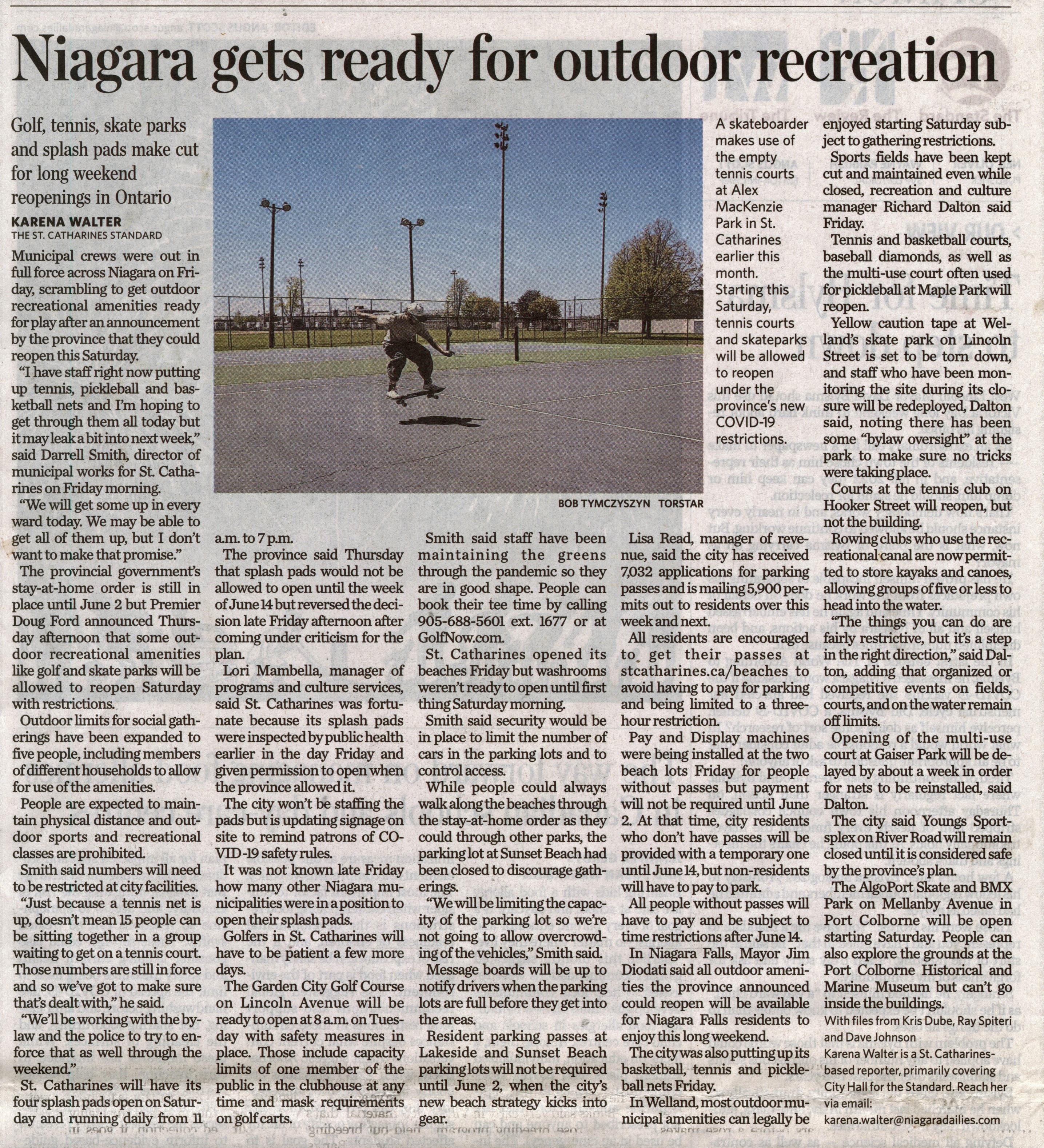 - Niagara gets ready for outdoor recreation : Golf, tennis, skate parks and splash pads make cut for long weekend reopenings in Ontario