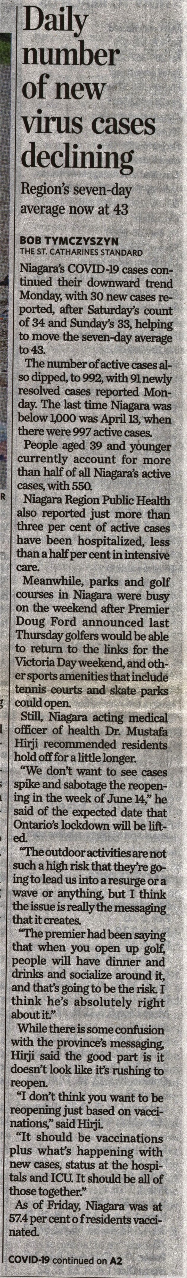- Daily number of new virus cases declining : Region's seven-day average now at 43