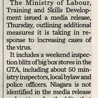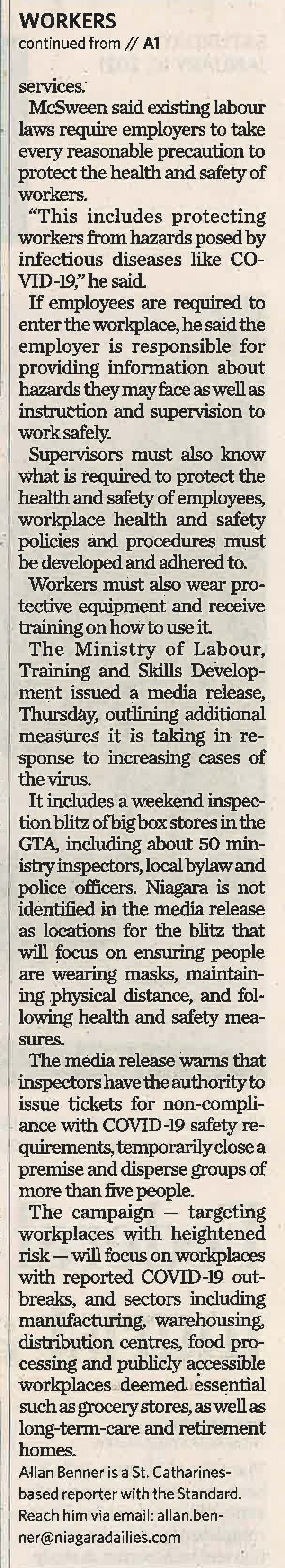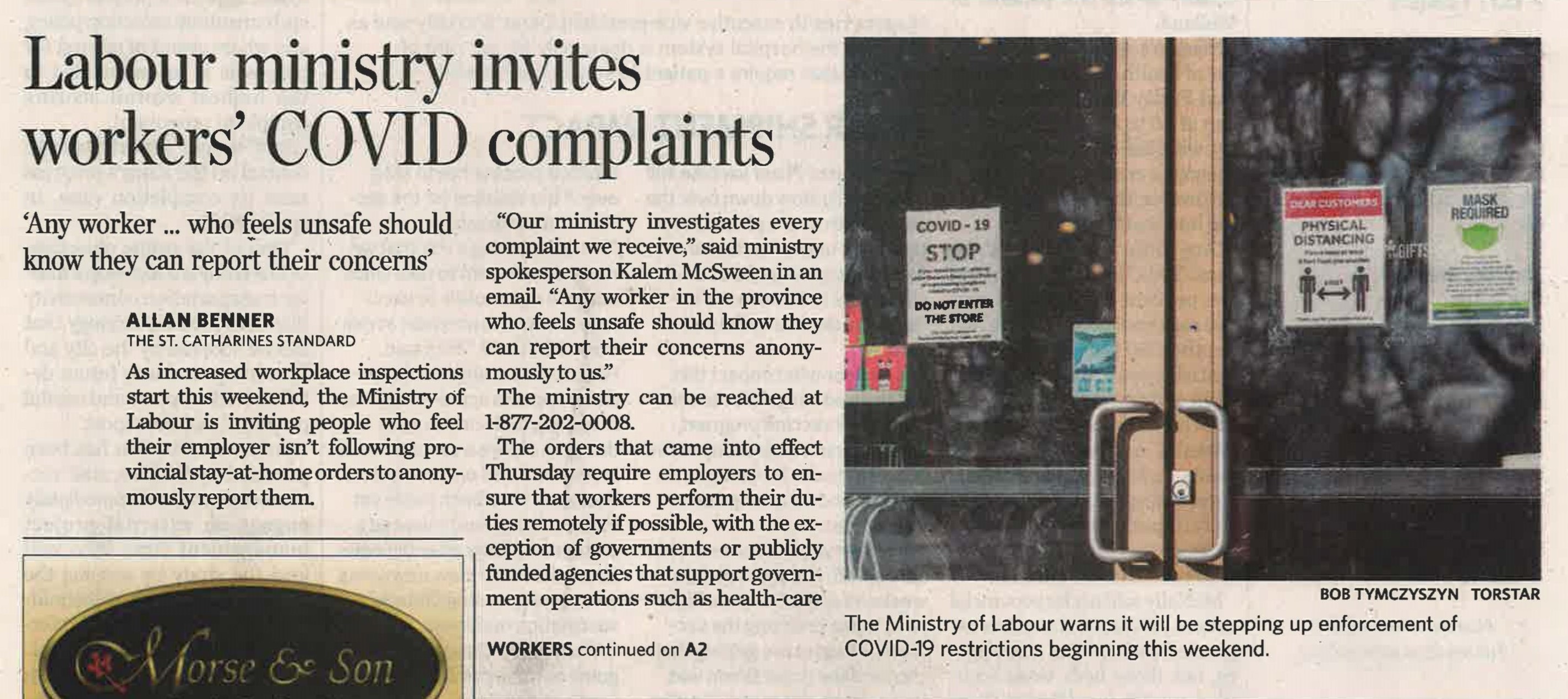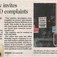 - Labour ministry invites workers' COVID complaints : "Any worker ... who feels unsafe should know they can report their concerns'
