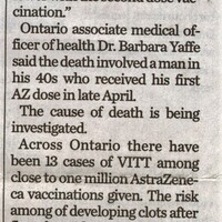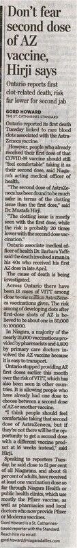 - Don't fear second dose of AZ vaccine, Hirji says : Ontario reports first clot related death, risk far lower for second jab