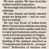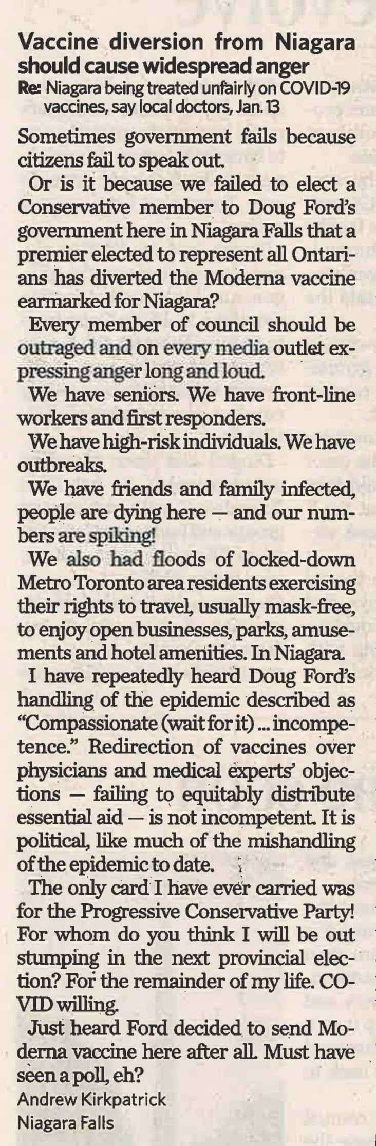- Vaccine diversion from Niagara should cause widespread anger Re: Niagara being treated unfairly on COVID-19 vaccines, say local doctors, Jan.13