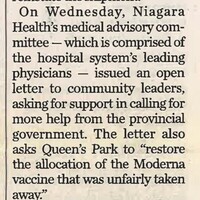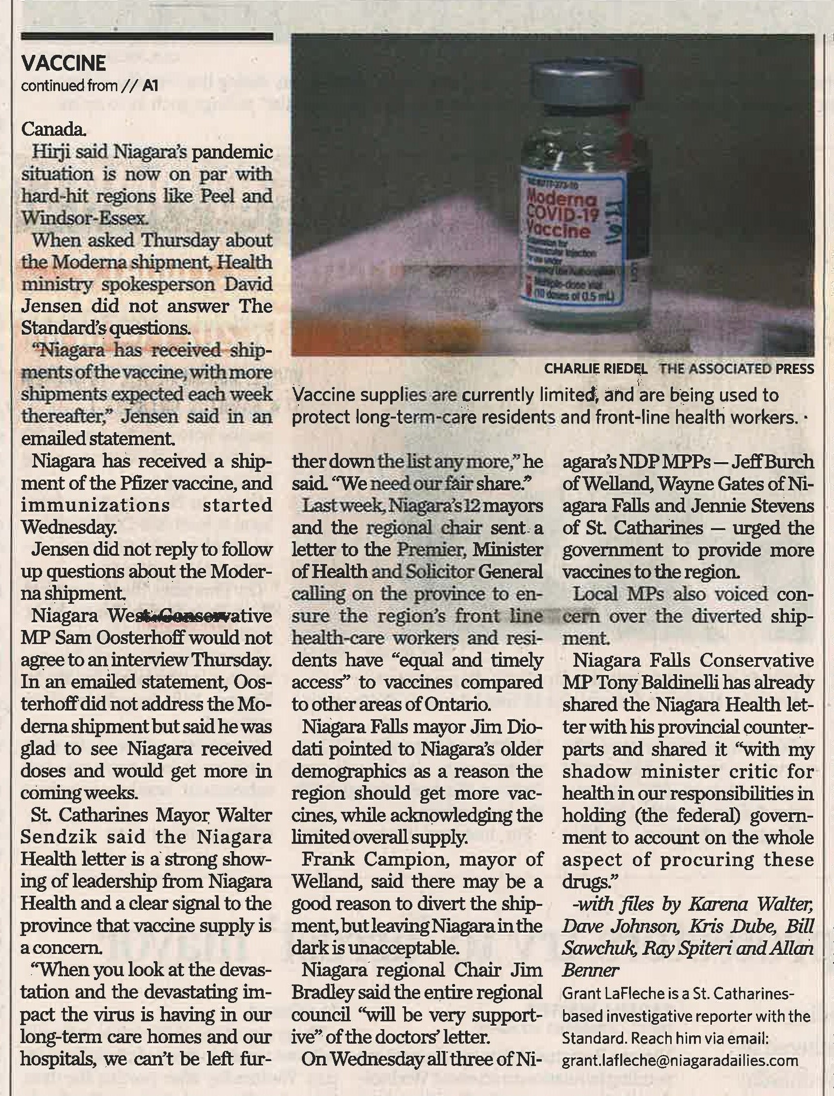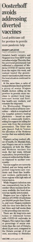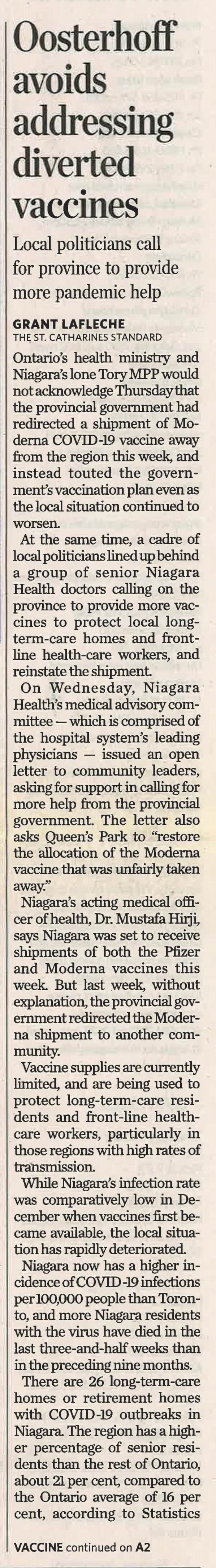 - Oosterhoff avoids addressing diverted vaccines : Local politicians call for province to provide more pandemic help