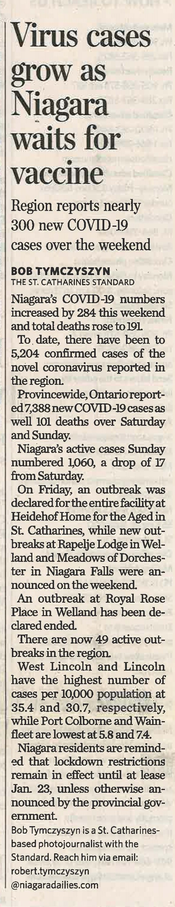 - Virus cases grow as Niagara waits for vaccine : Region reports nearly 300 new COVID-19 cases over the weekend