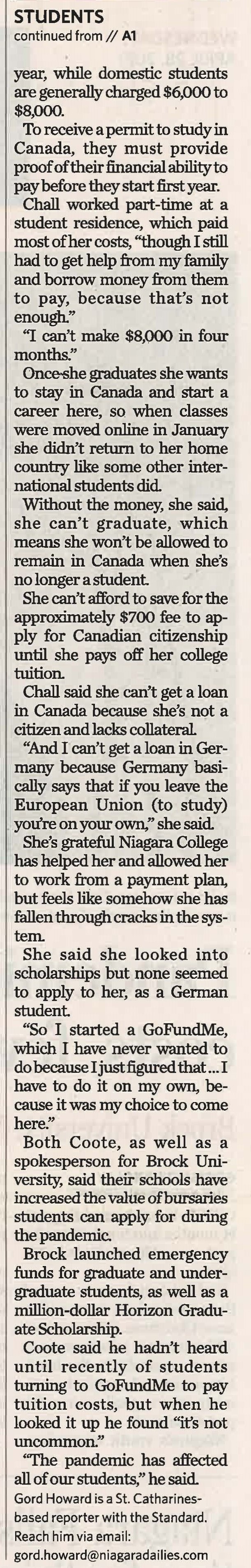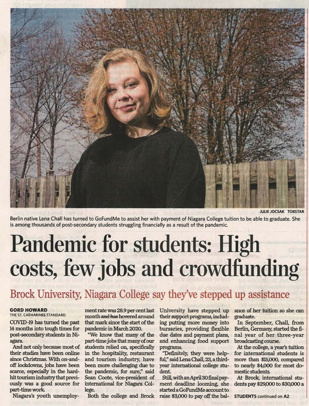 - Chall, Lena / GoFundMe / Niagara College / youth unemployment / Coote, Sean / international students / Brock University / COVID 19 pandemic