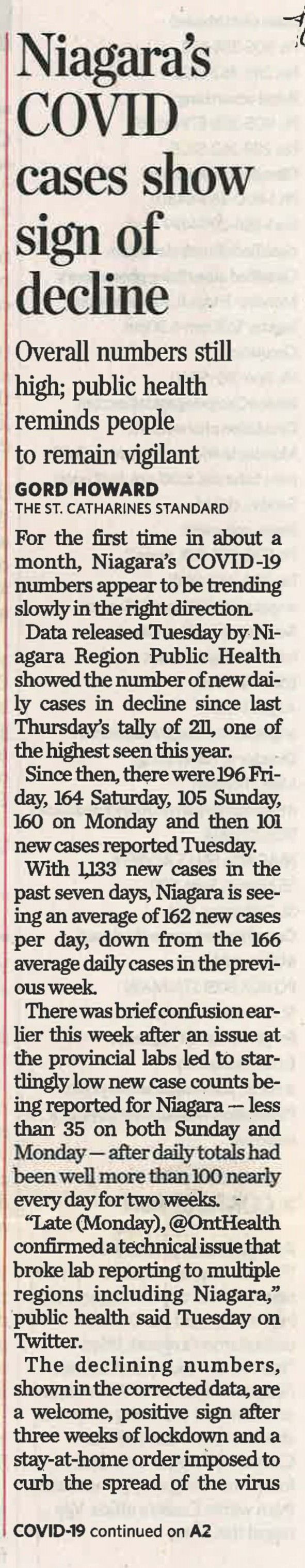 - Niagara's COVID cases show sign of decline : Overall numbers still high: public health reminds people to remain vigilant