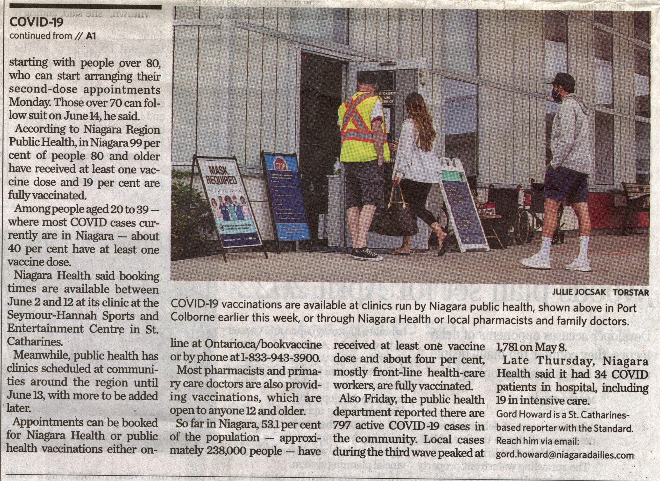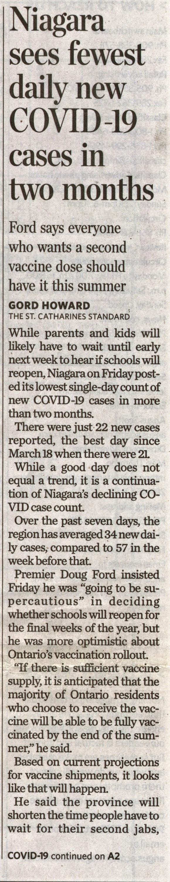- Niagara sees fewest daily new COVID-19 cases in two months : Ford says everyone who wants a second vaccine dose should have it this summer
