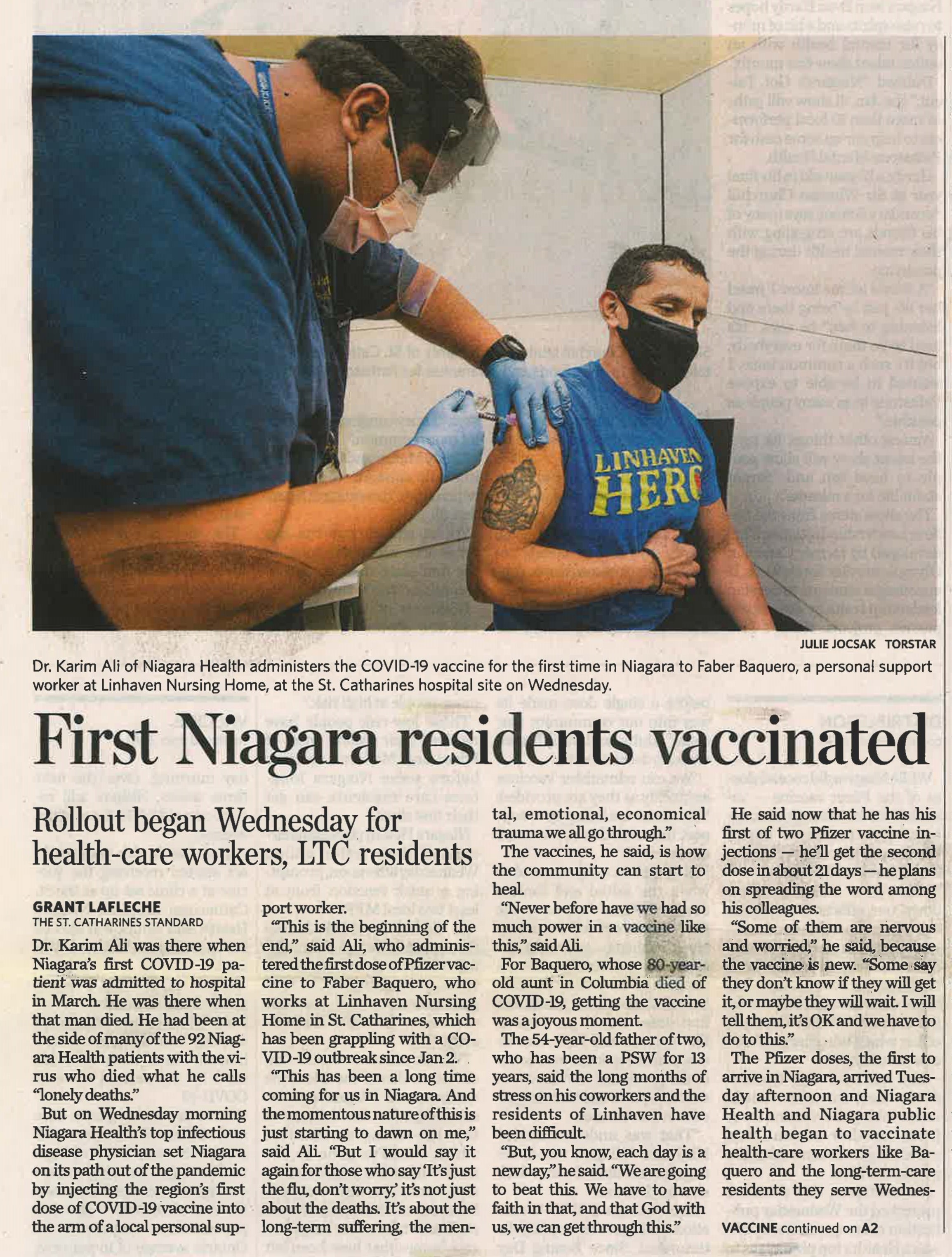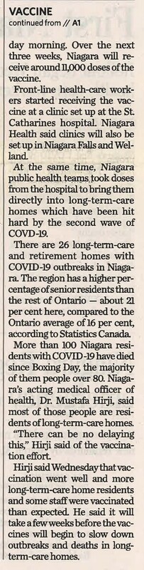 - First Niagara residents vaccinated : Rollout began Wednesday for health-care workers, LTC residents