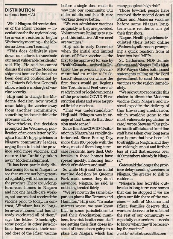 - Doctors say vaccine distribution inequitable : Province redirected Moderna shipment away from Niagara