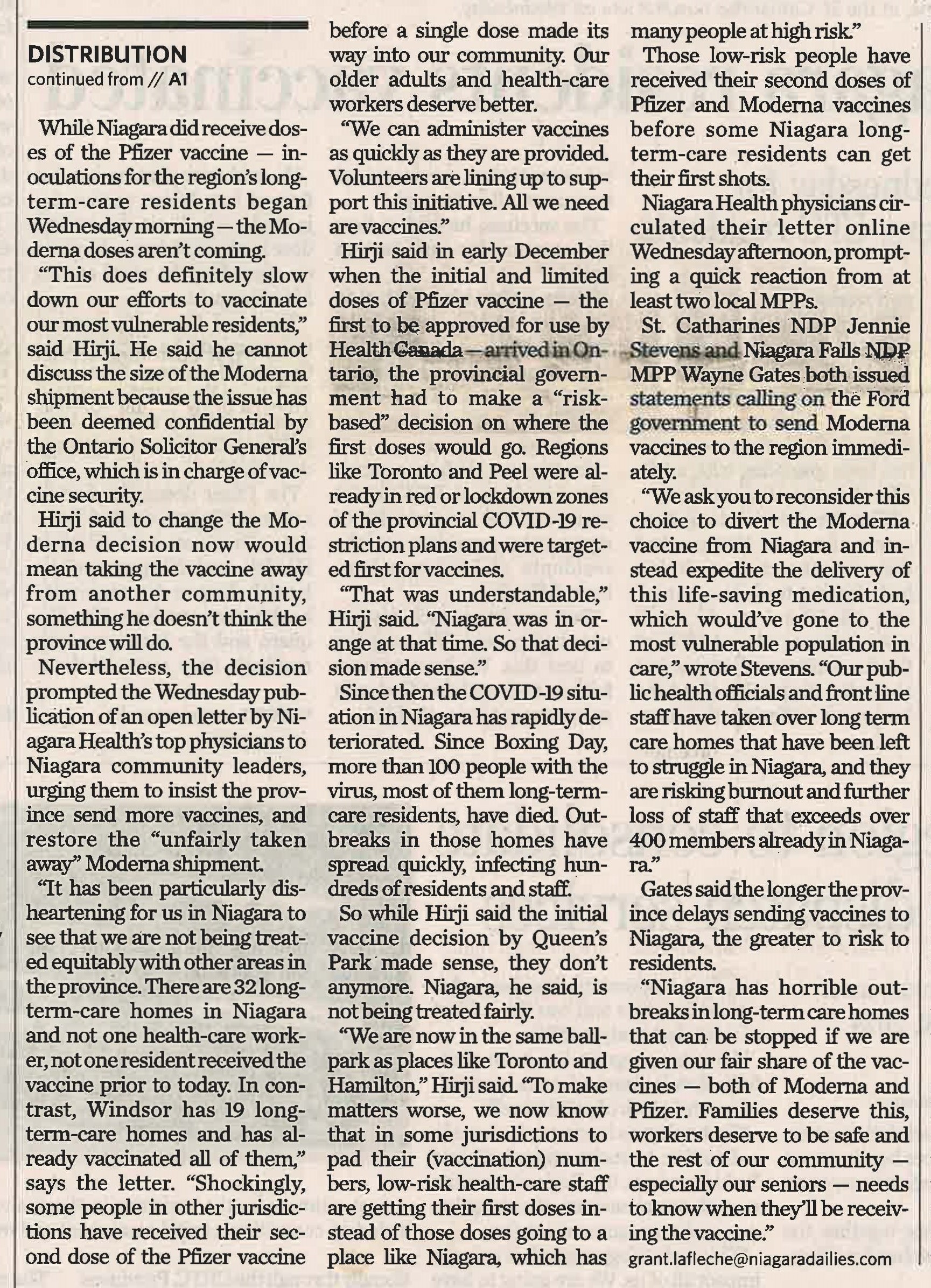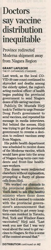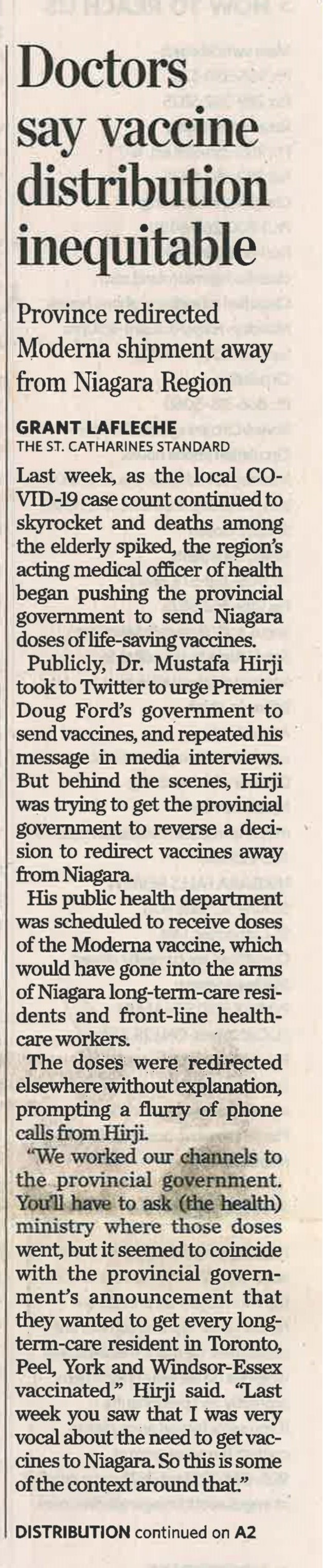 Doctors say vaccine distribution inequitable : Province redirected Moderna shipment away from Niagara