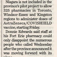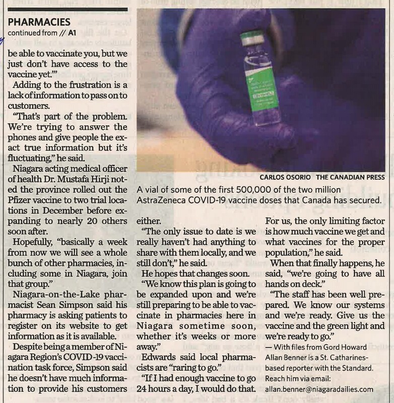 Pharmacists eager, ready to start vaccinations : Customers anxious to learn when shots will be expanded to Niagara