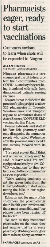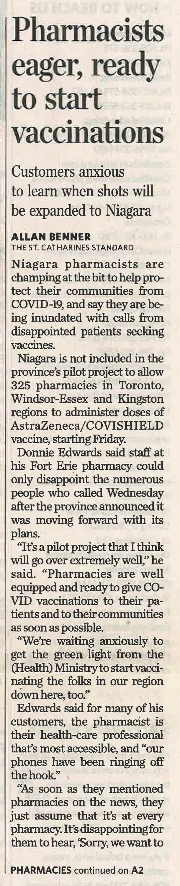 - Pharmacists eager, ready to start vaccinations : Customers anxious to learn when shots will be expanded to Niagara