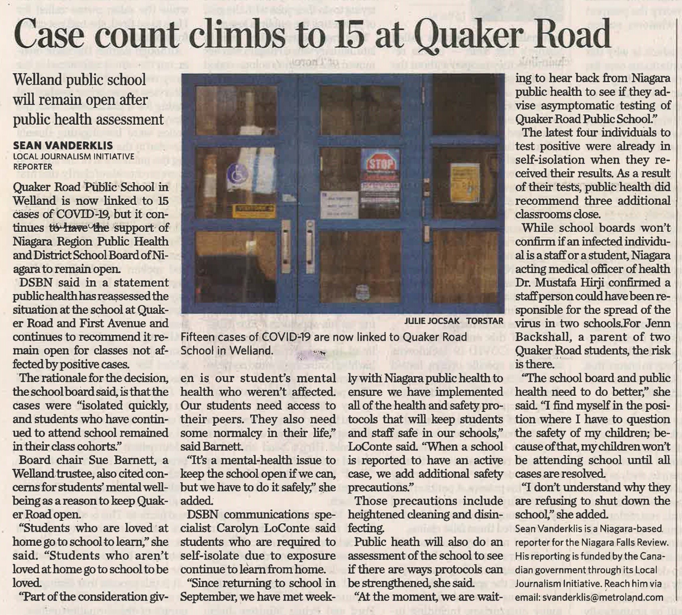 - Case count climbs to 15 at Quaker Road : Welland public school will remain open after public health assessment