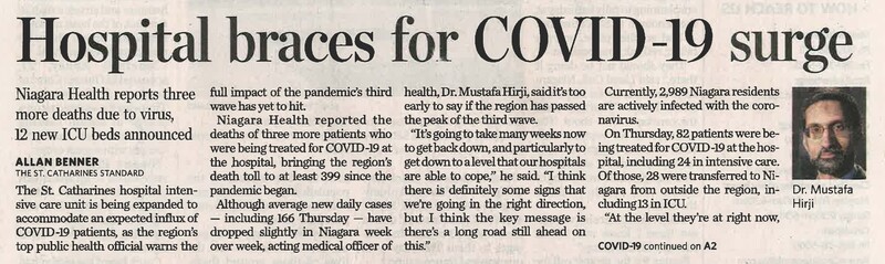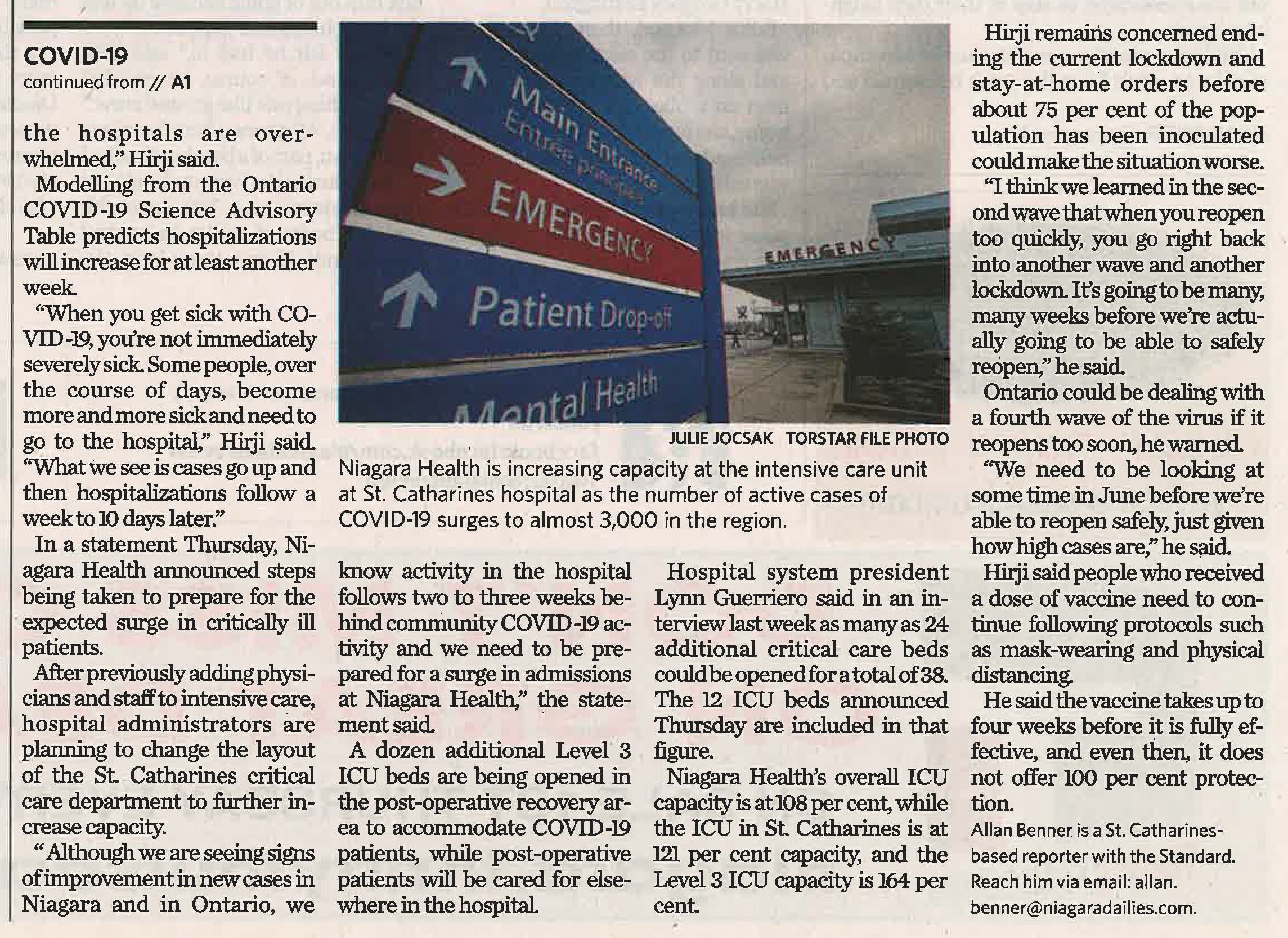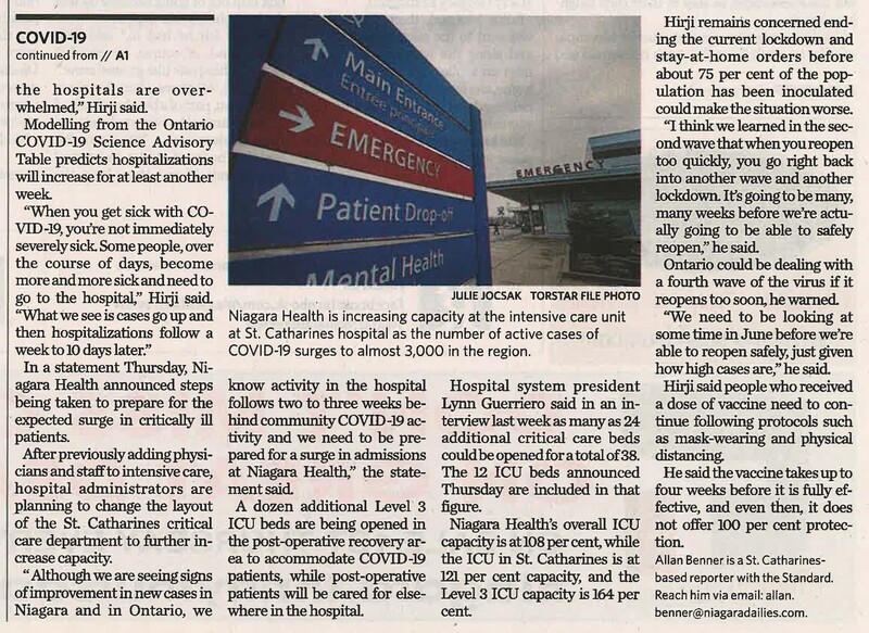 - Hospital braces for COVID-19 surge : Niagara Health reports three more deaths due to virus, 12 new ICU beds announced