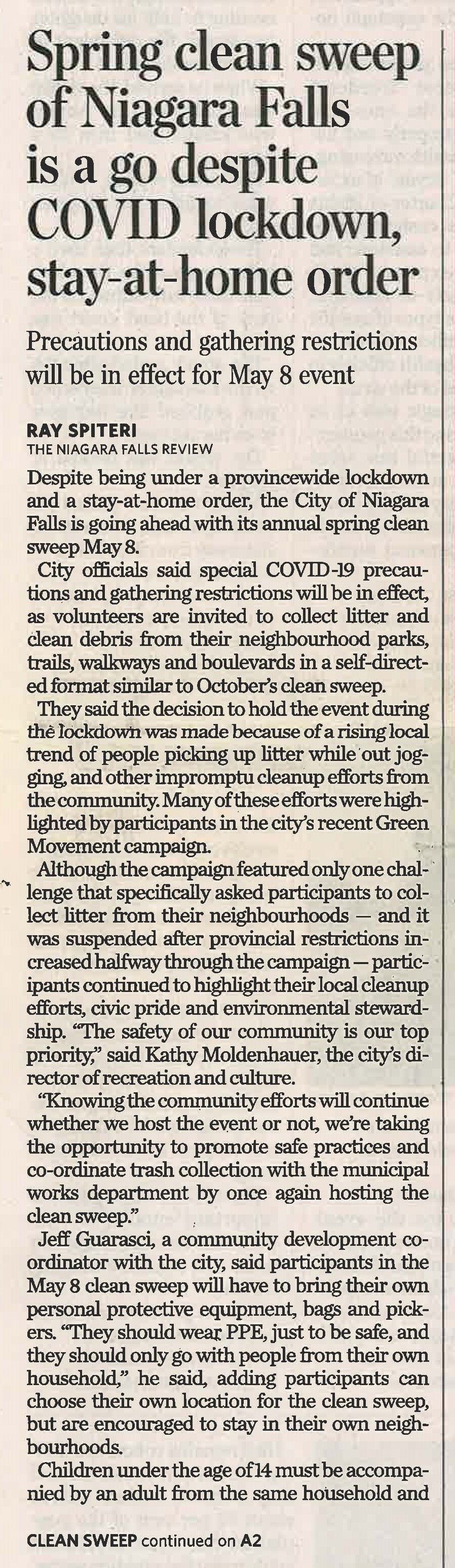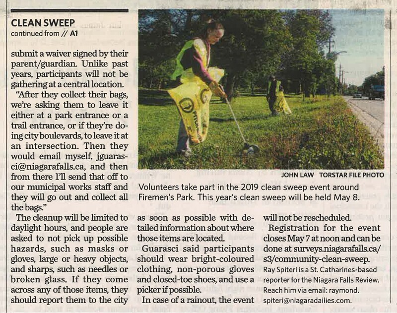 - Spring clean sweep of Niagara Falls is a go despite COVID lockdown, stay-at-home order : Precautions and gathering restrictions will be in effect for May 8 event