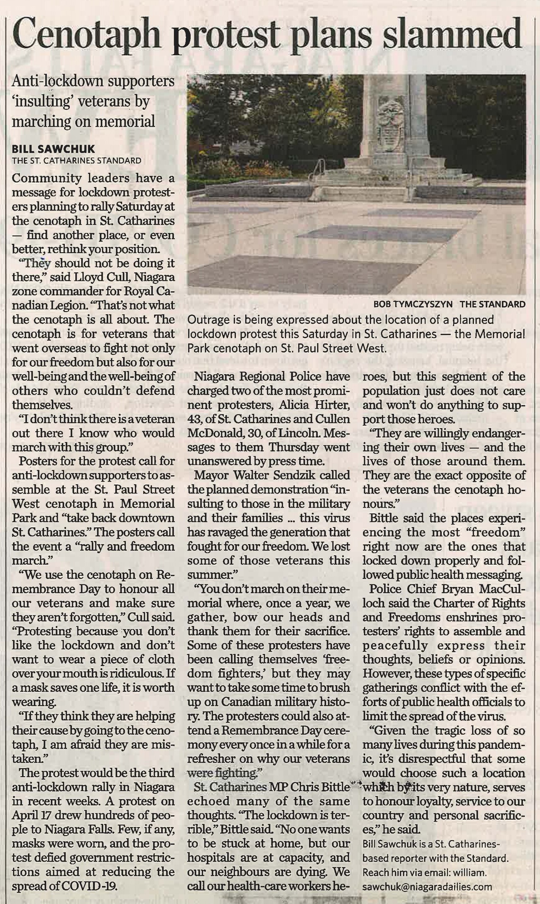 - Memorial Park cenotaph / lockdown protesters / Cull, Lloyd / Royal Canadian Legion / COVID 19 pandemic / Niagara Regional Police