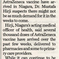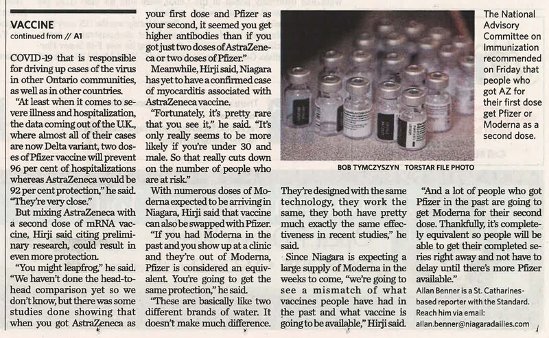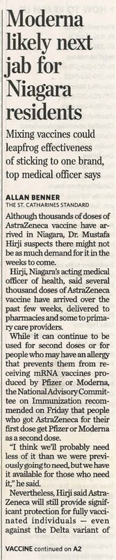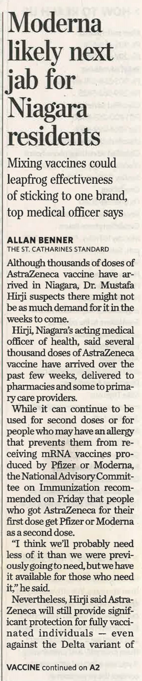 - Moderna likely next jab for Niagara residents : mixing vaccines could leapfrog effectiveness of sticking to one brand, top medical officer says