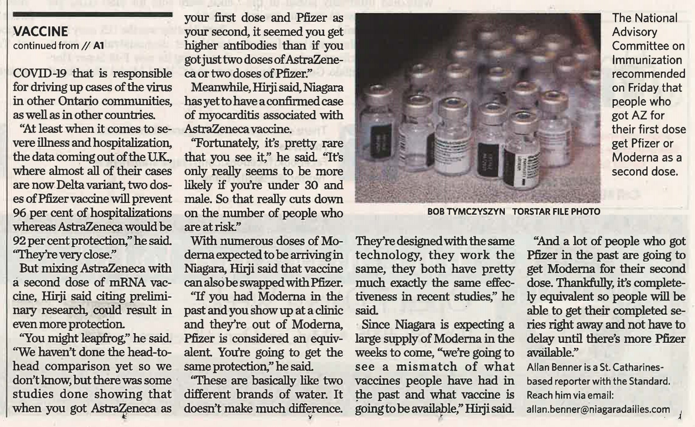 Moderna likely next jab for Niagara residents : mixing vaccines could leapfrog effectiveness of sticking to one brand, top medical officer says